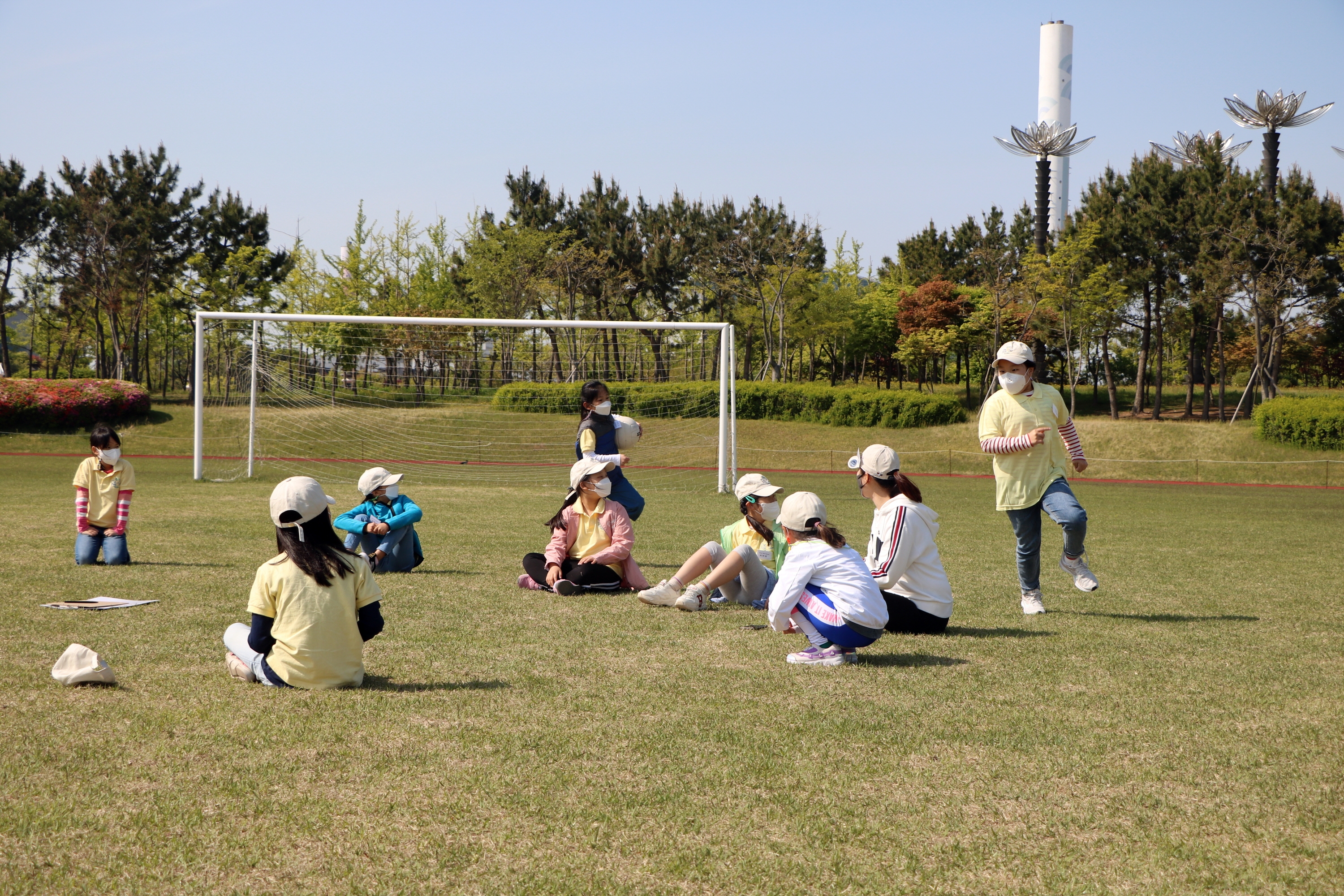 몸풀기의 일환으로 공을 가지고 수건돌리기 놀이를 하며 즐거운 시간을 보내고 있는 아이들