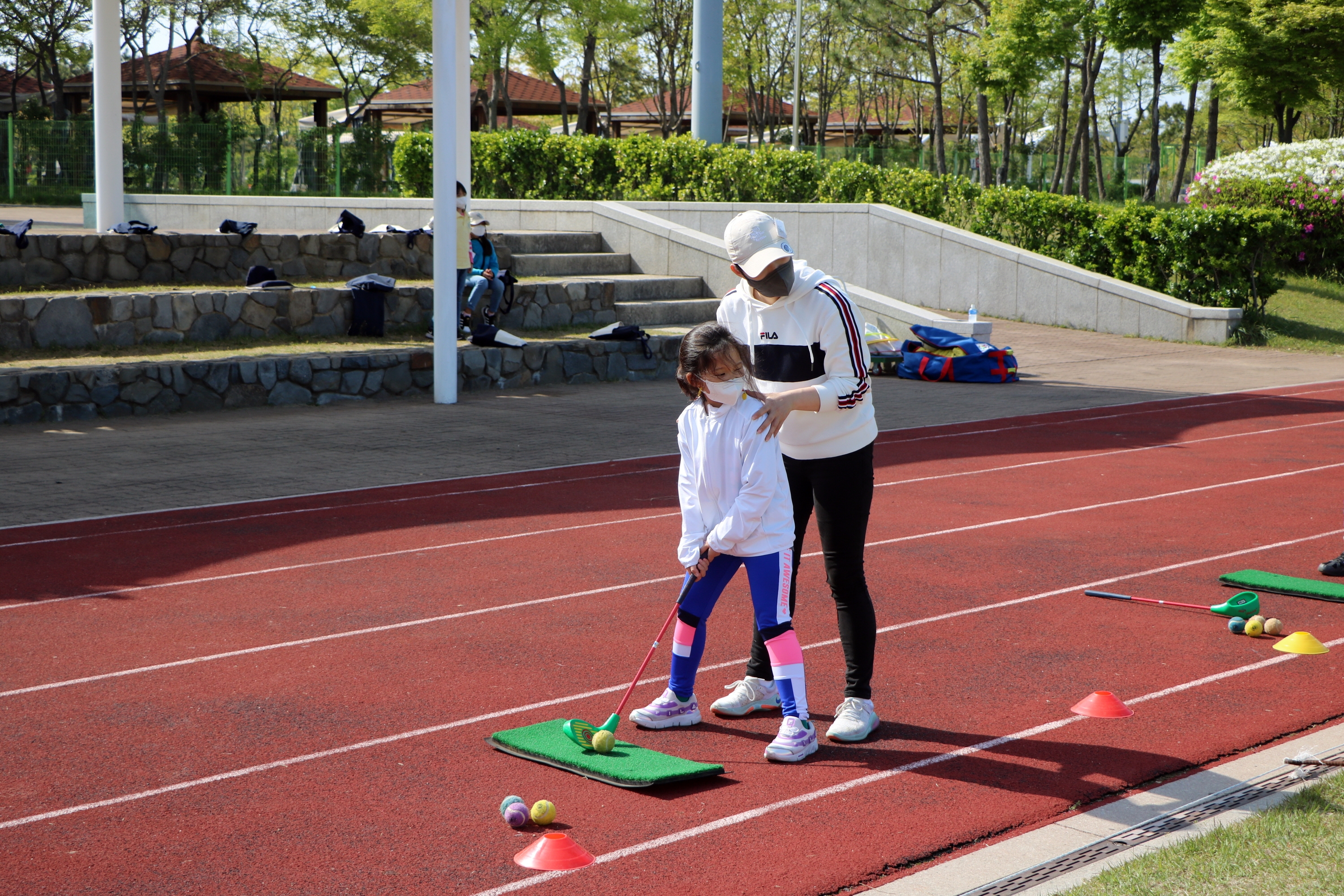원하는 방향으로 정확하게 공을 보내기 위해선 목표방향과 수직이 되게 어드레스를 해야 한다는 것을 가르쳐 주고 있는 모습