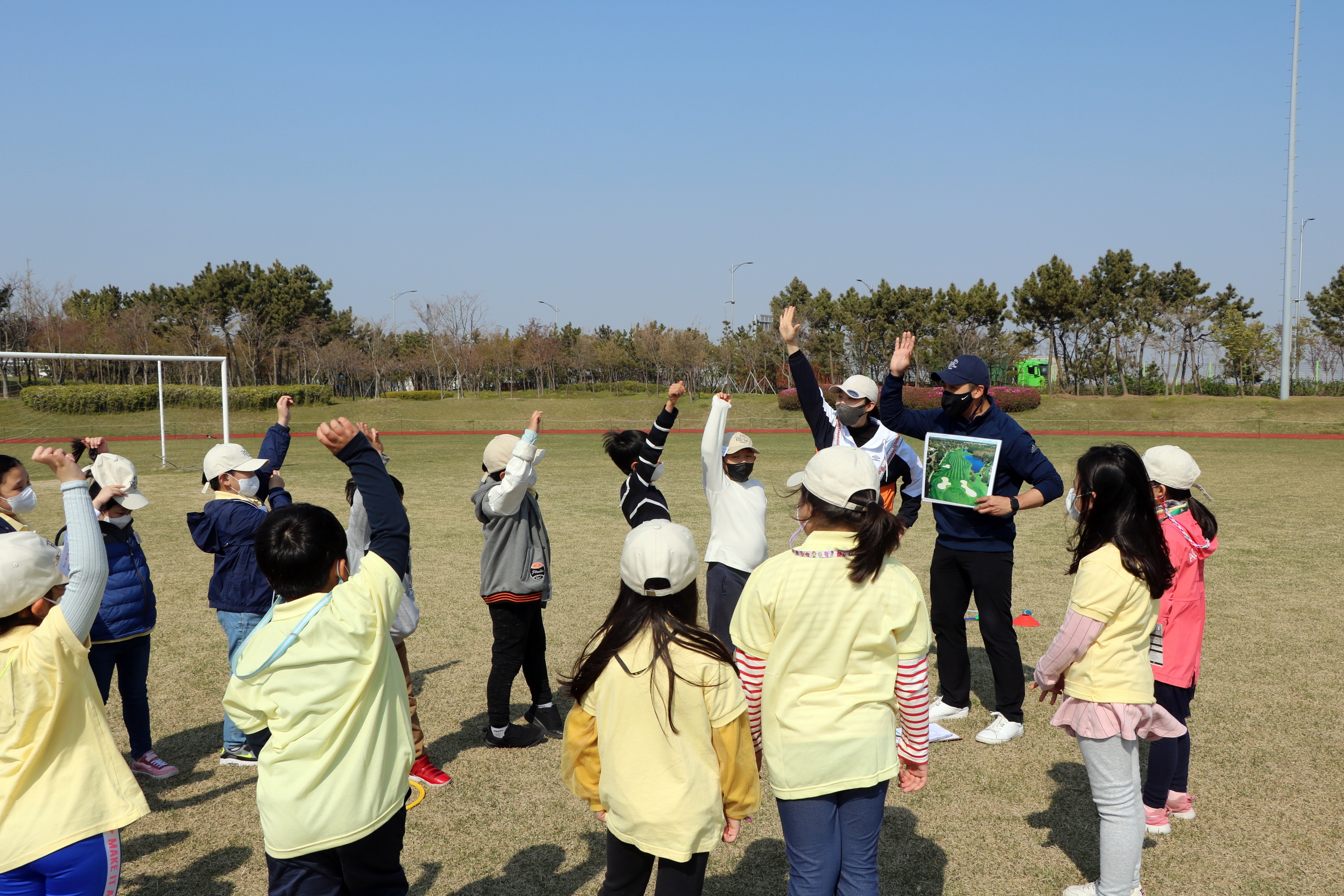 코치님이 내주신 골프코스명칭 맞추기 퀴즈를 서로 답하기 위해 재빠르게 손을 들고 있는 아이들