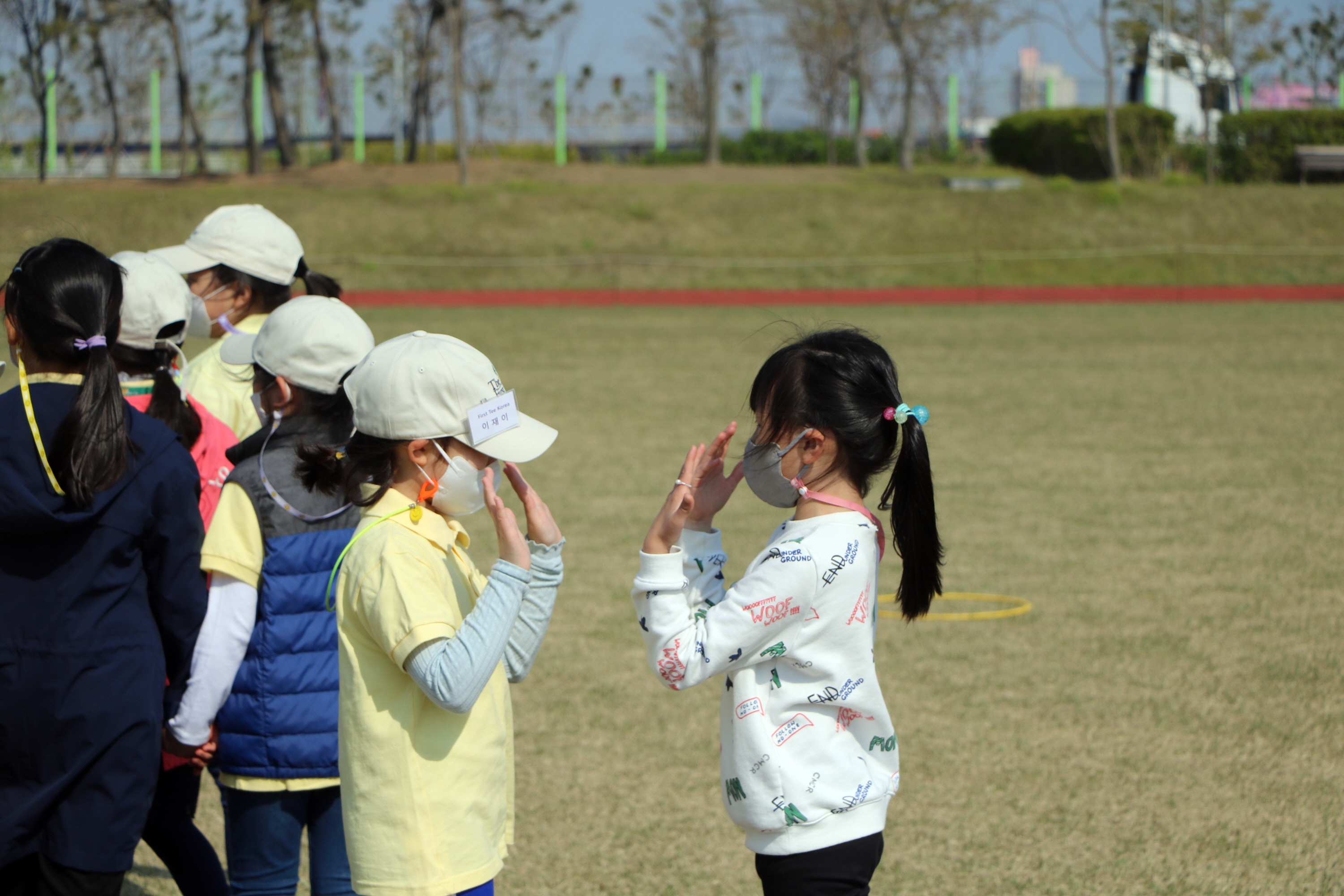 잠깐 코치님의 눈을 피해 친구와 쎄쎄쎄 놀이를 하고 있는 아이들 모습