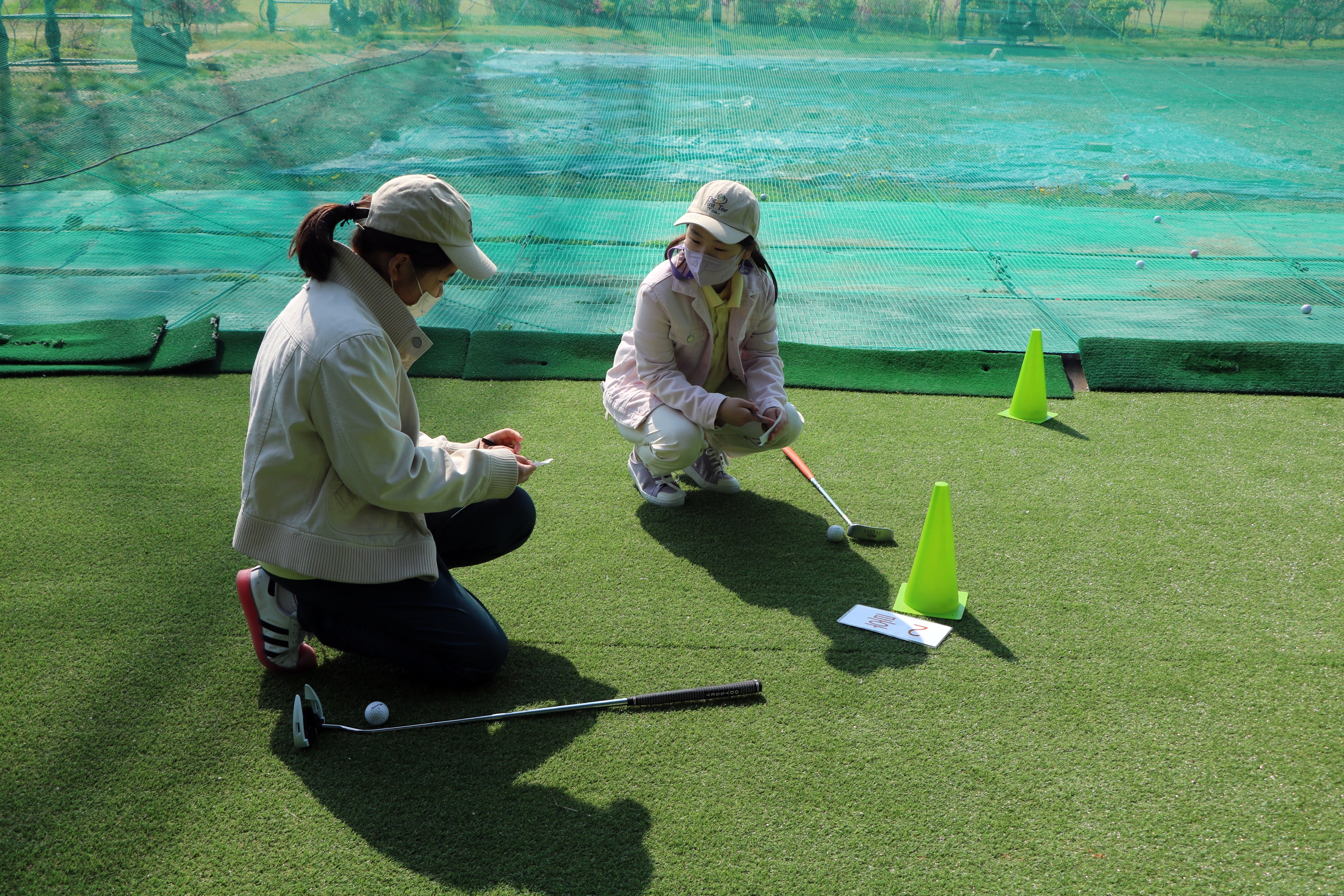 퍼팅게임을 하면서 직접 자신의 스코어를 스코어카드에 적어보고 있는 아이들