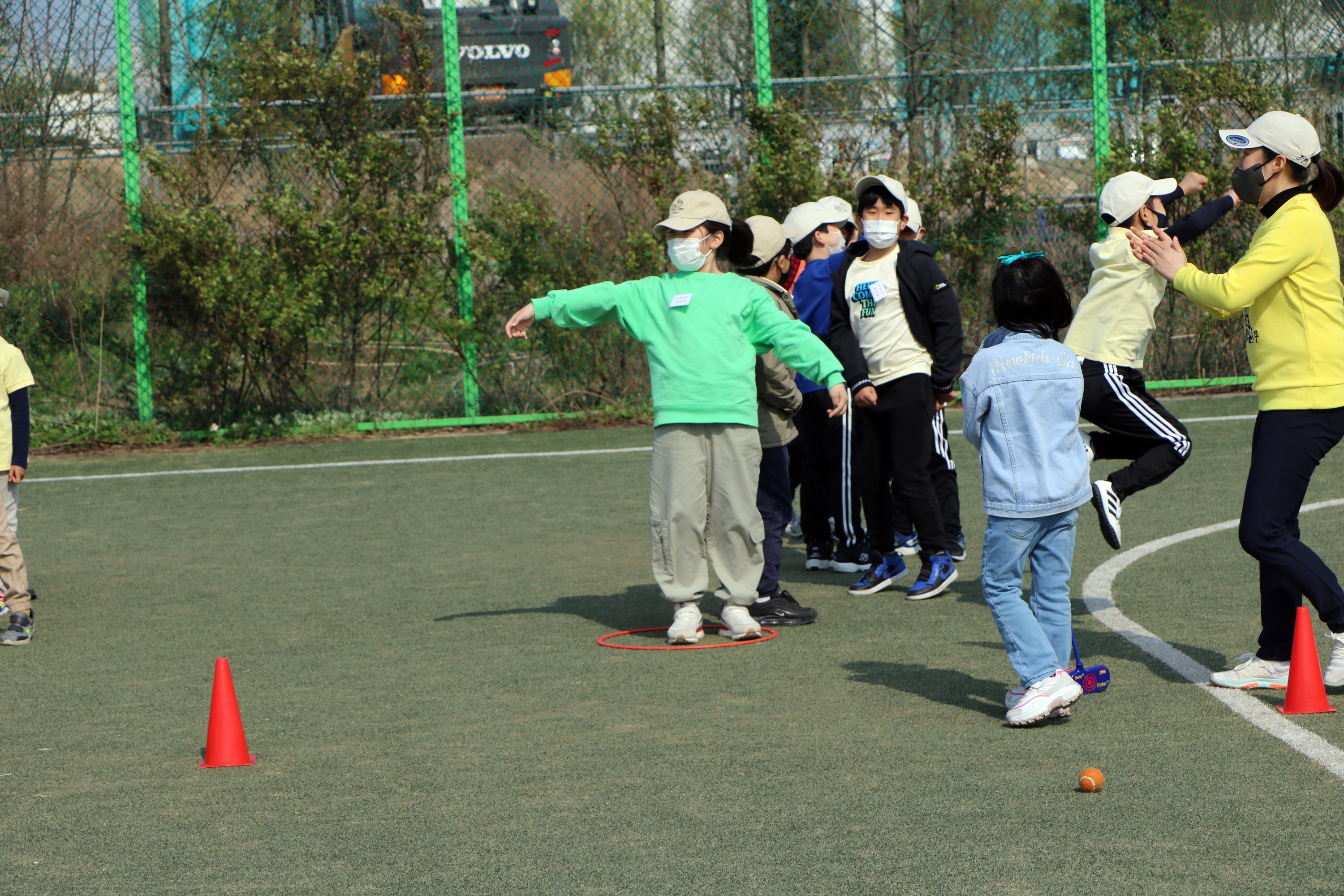 팀 대항전에서 승리를 한 후 기뻐하는 아이들과 이를 축하해 주는 코치