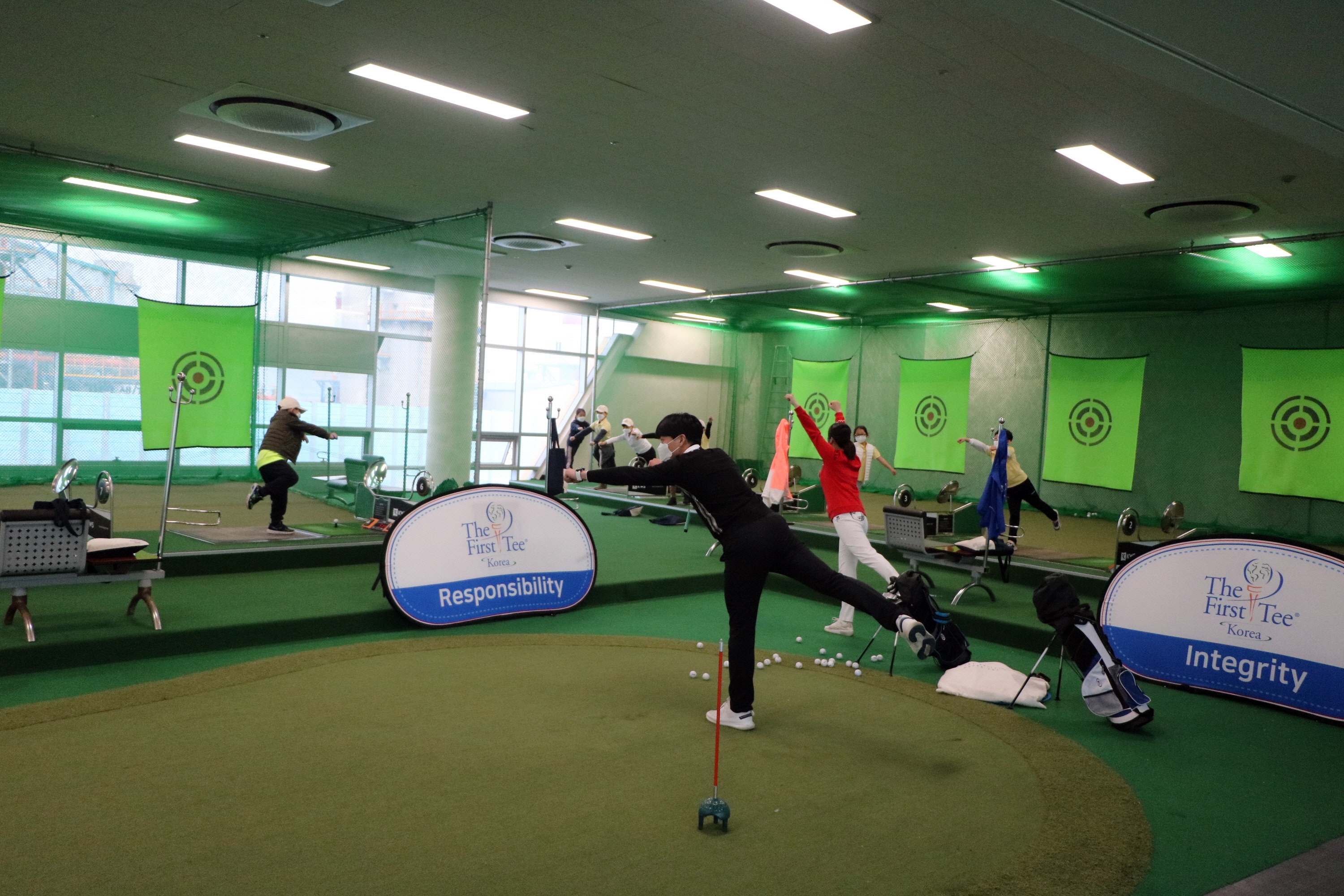 본격적인 골프실습에 앞서 부상방지를 위해 코치님을 따라 몸풀기를 하고 있는 모습