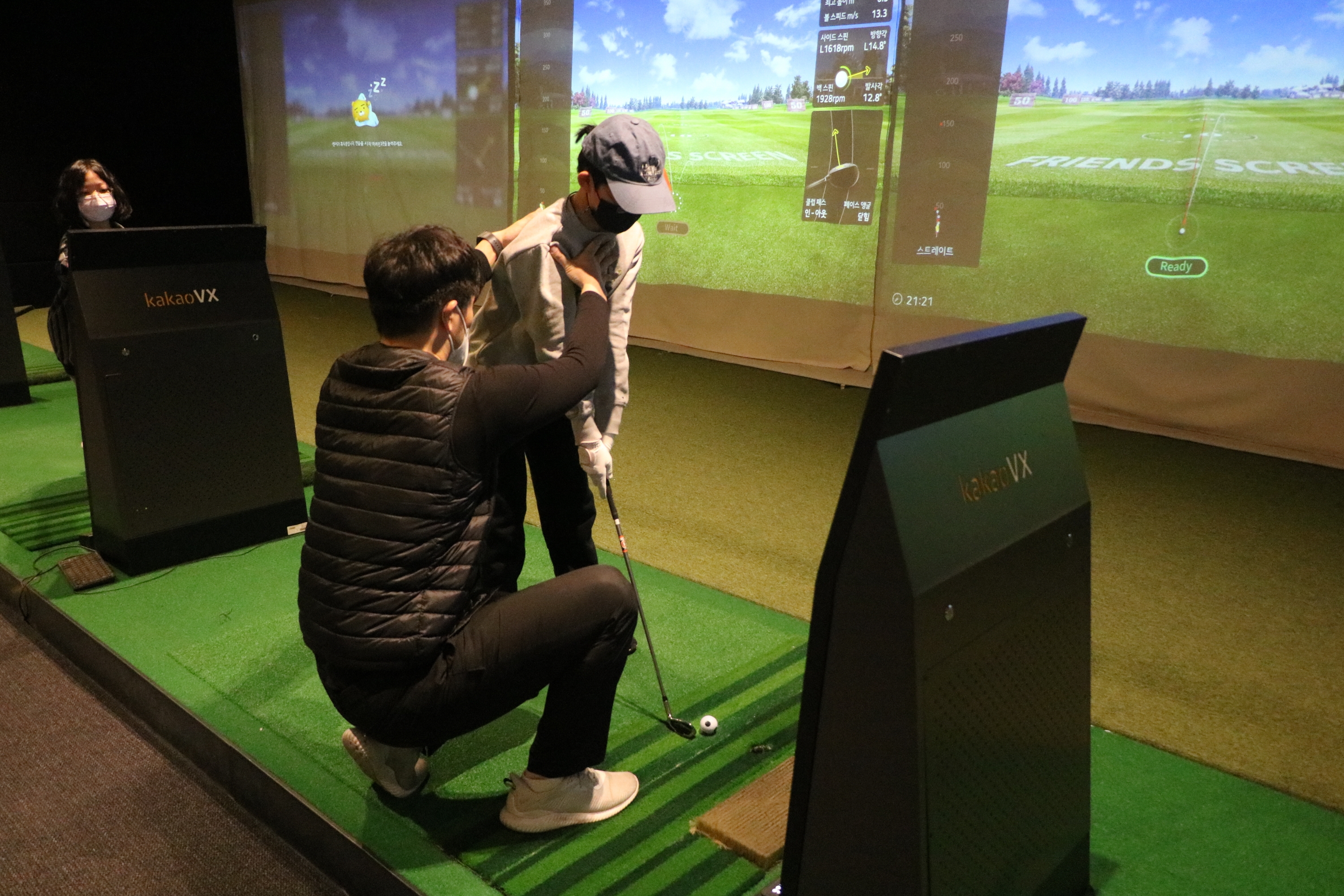 어드레스 시 상체를 너무 숙이지 않도록 교정해 주고 있는 모습