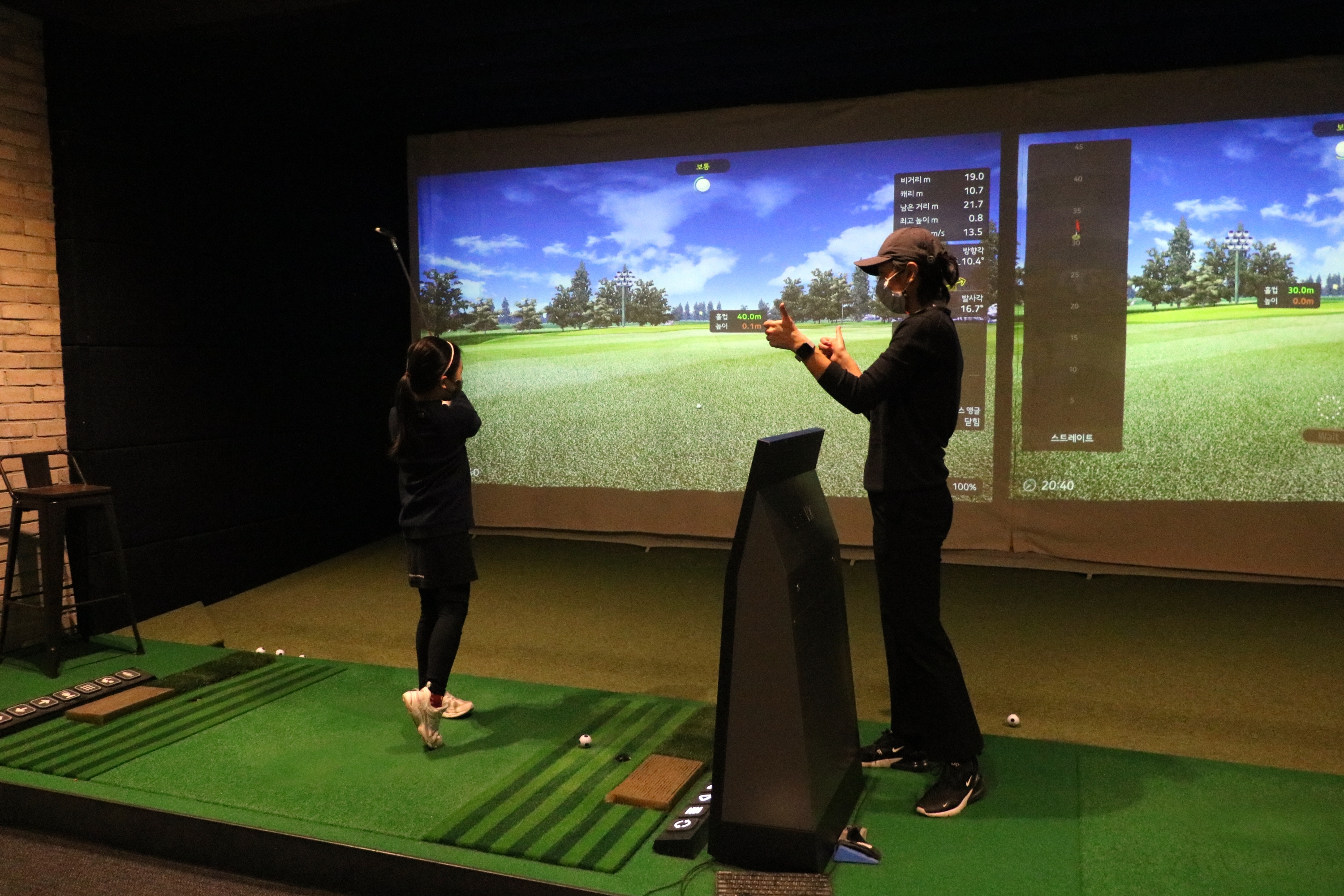 레슨 받은 대로 완벽한 칩샷을 날린 교육생을 격려해 주고 있는 모습