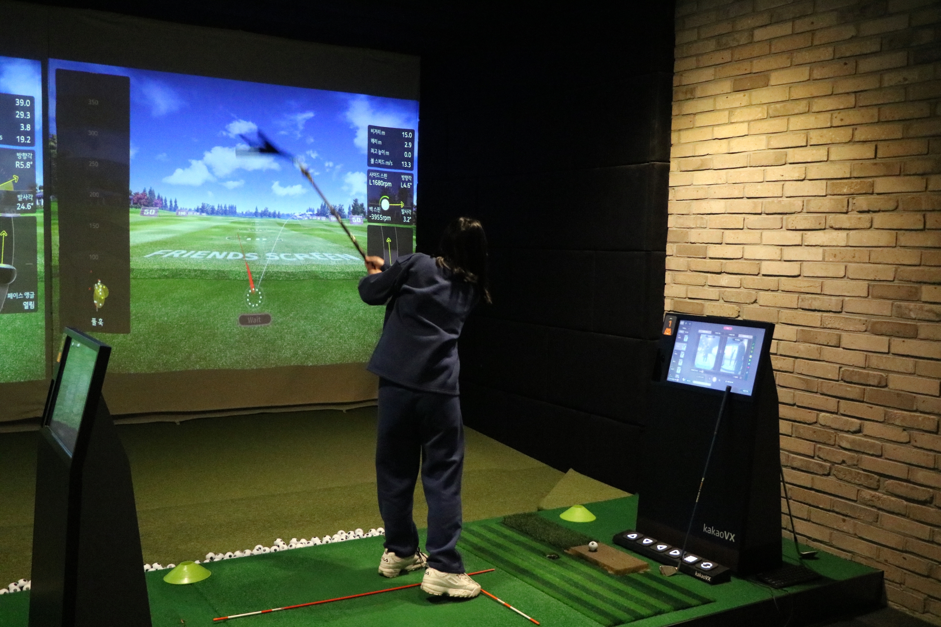 톱핑방지를 위해 먼지털이개처럼 생긴 도구로 쓸어치는법을 가르쳐 주고 있는 모습
