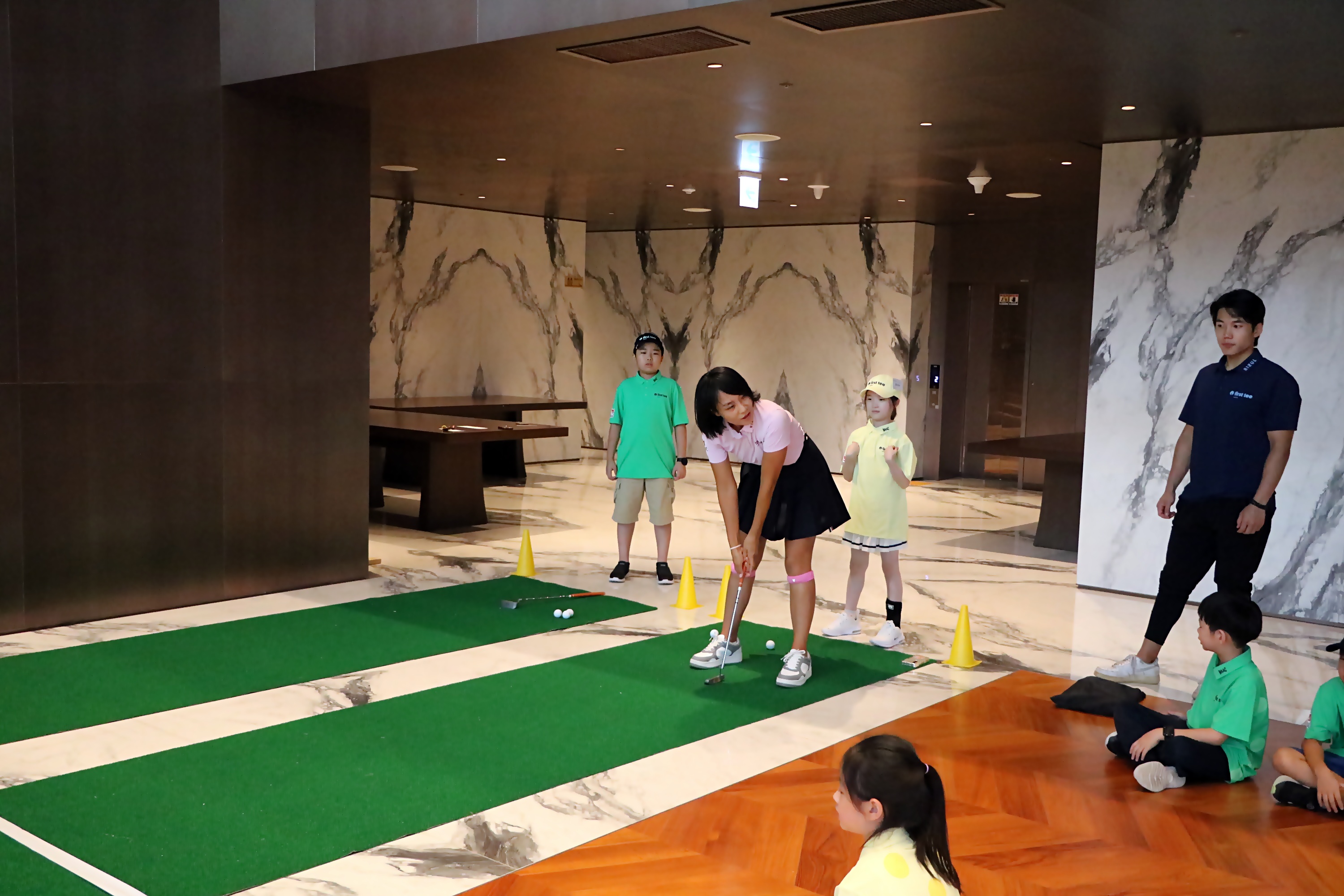 퍼팅 거리 맞추기 실습에 앞서 스윙크기에 따른 거리 조절법에 대해서 설명하고 있는 모습