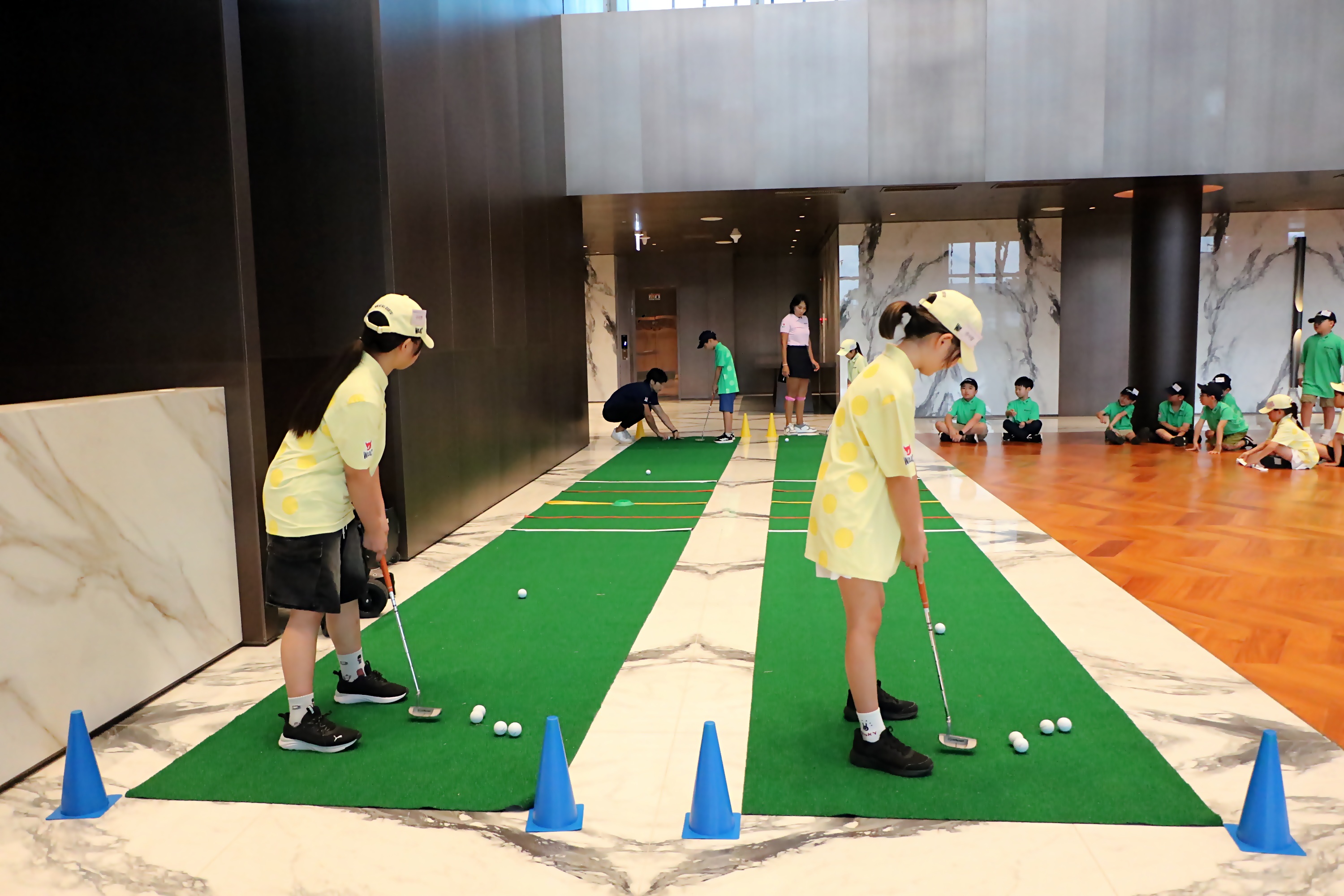 퍼팅으로 가운데 실리콘 홀에 공넣기를 시도하고 있는 아이들