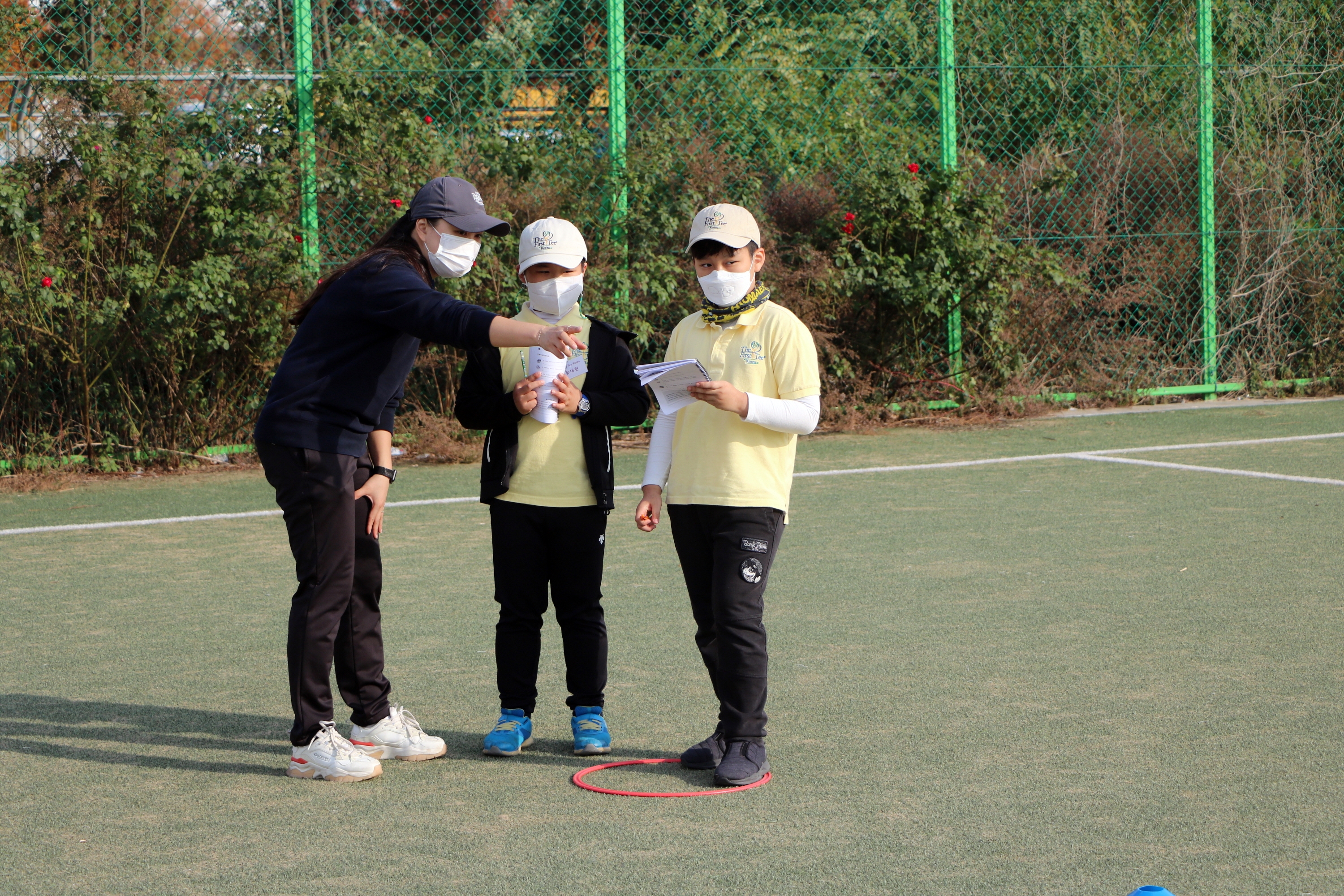 타겟까지의 거리를 3가지 종류로 다르게 한 퍼팅게임에 대해서 아이들에게 설명하고 있는 코치님