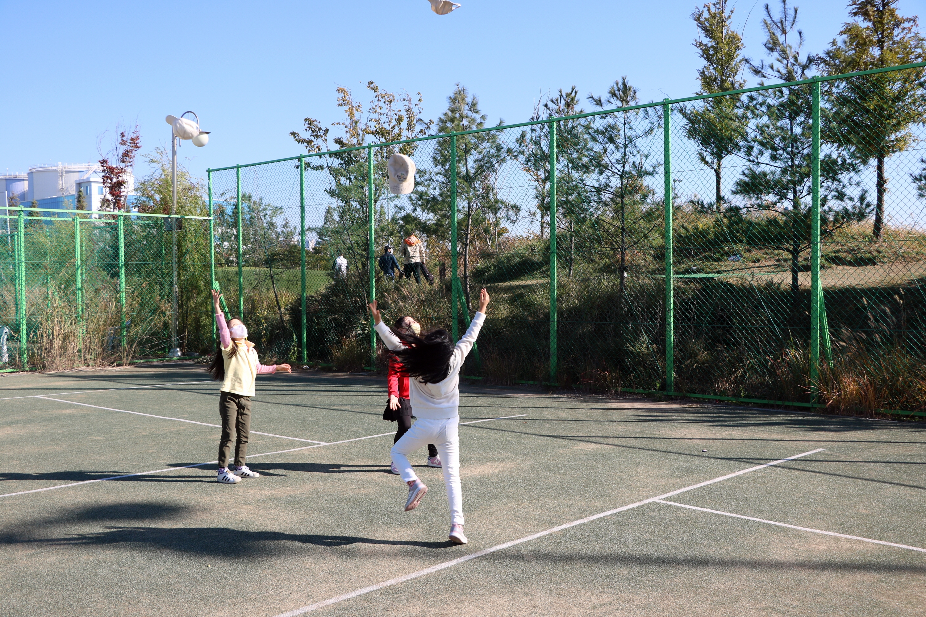 잠시 쉬는 시간에도 친해진 친구들과 삼삼오오 모여 하늘로 모자던지기 놀이를 하며 즐거워하는 아이들