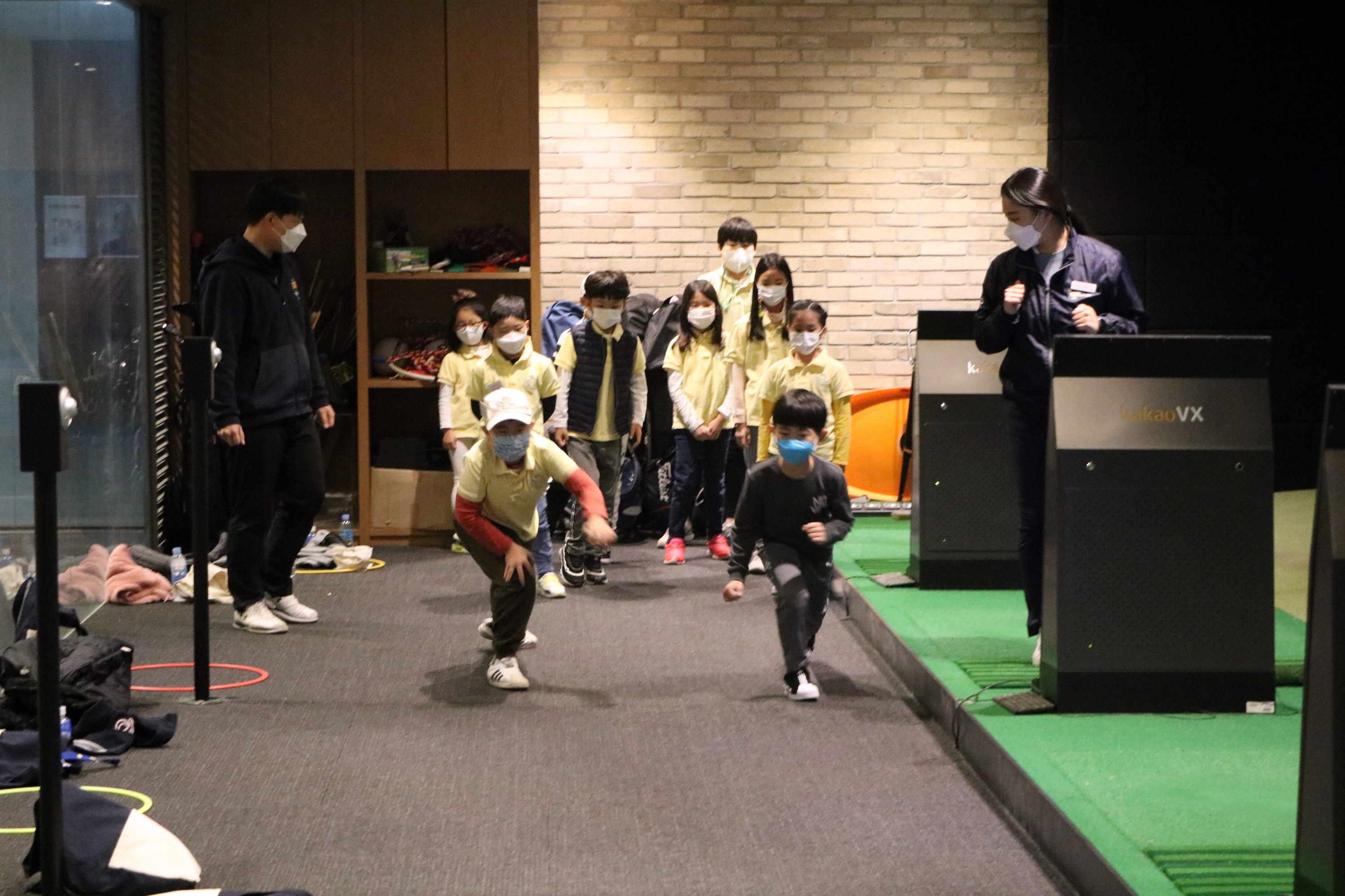 실내 공간을 이용해 코치님을 따라 런지동작을 하며 몸을 풀고 있는 아이들