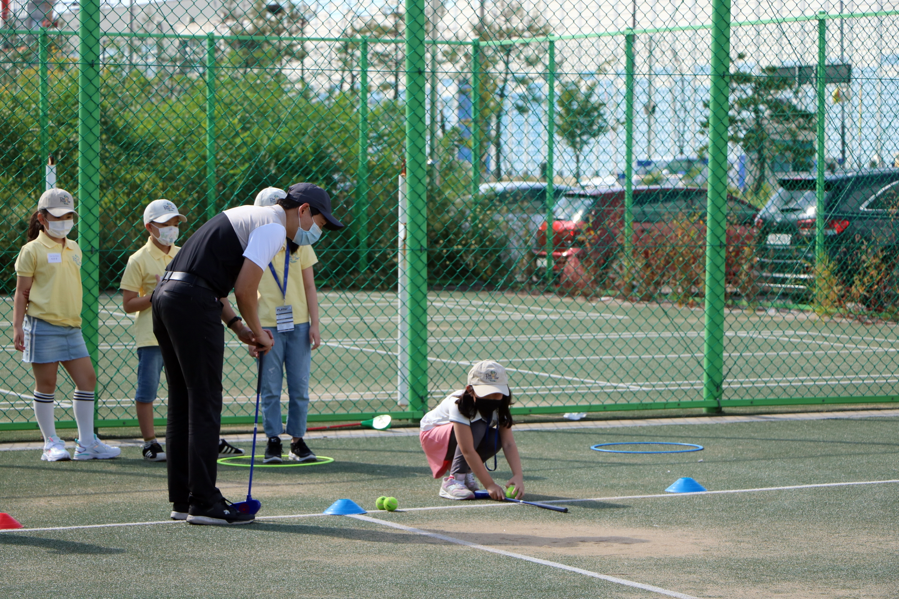 목표지점을 바라보며 공이 굴러갈 방향을 예상하면서 에이밍을 하고 있는 교육생