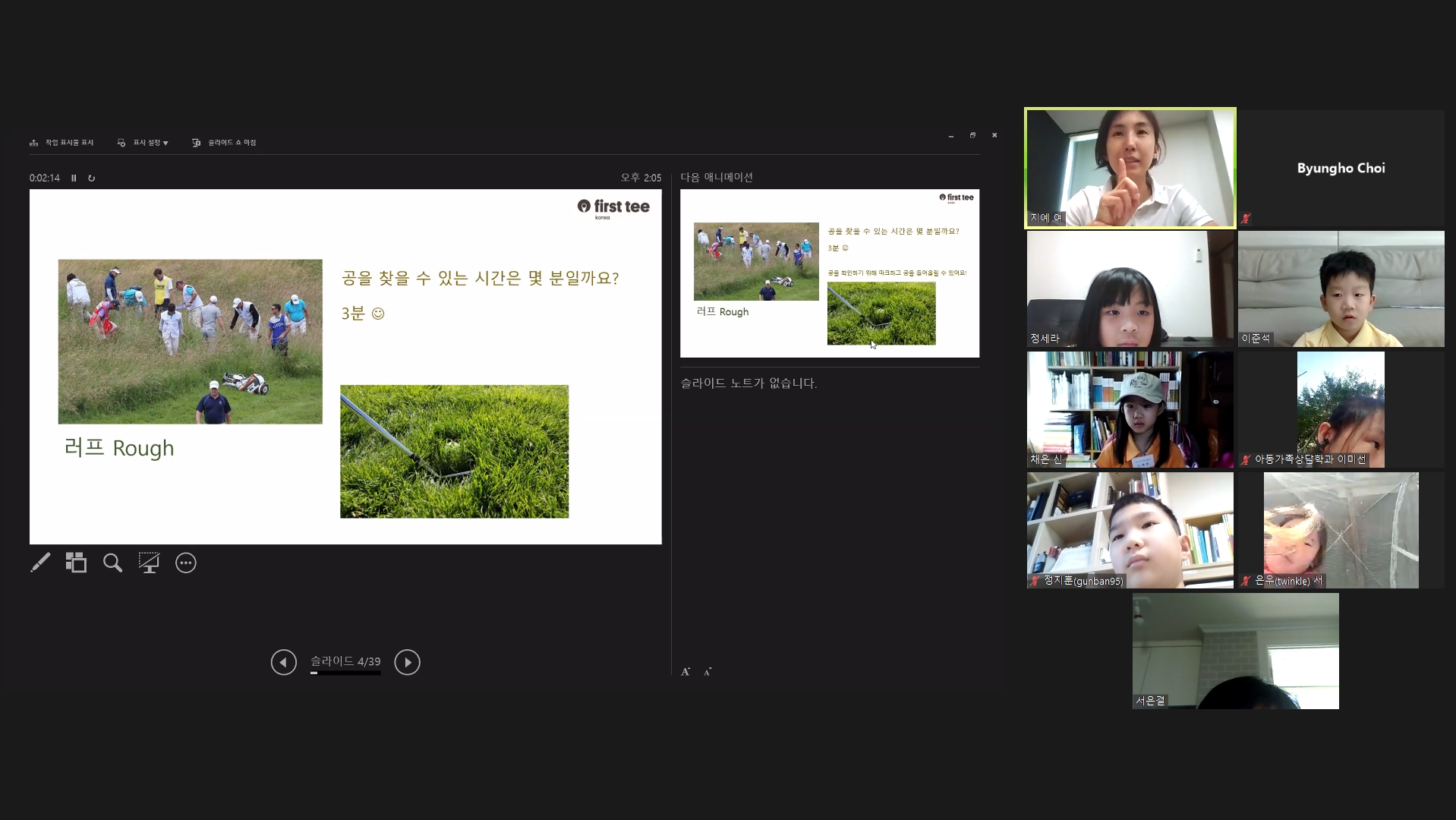 러프에 볼이 들어갔을 때 공을 찾을 수 있는 시간은 최대 3분이라는 것을 설명해 주는 모습