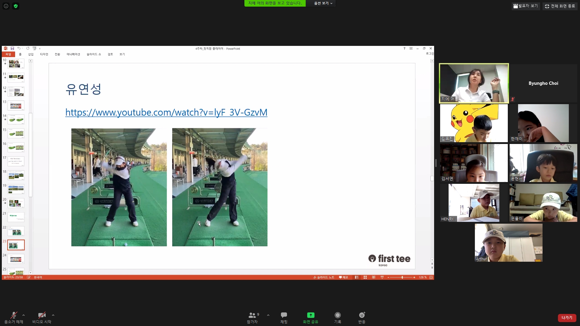 유연성을 길러주는 운동을 틈틈히 해두어야 나중에 골프를 더 잘 할 수 있다고 설명해 주는 모습
