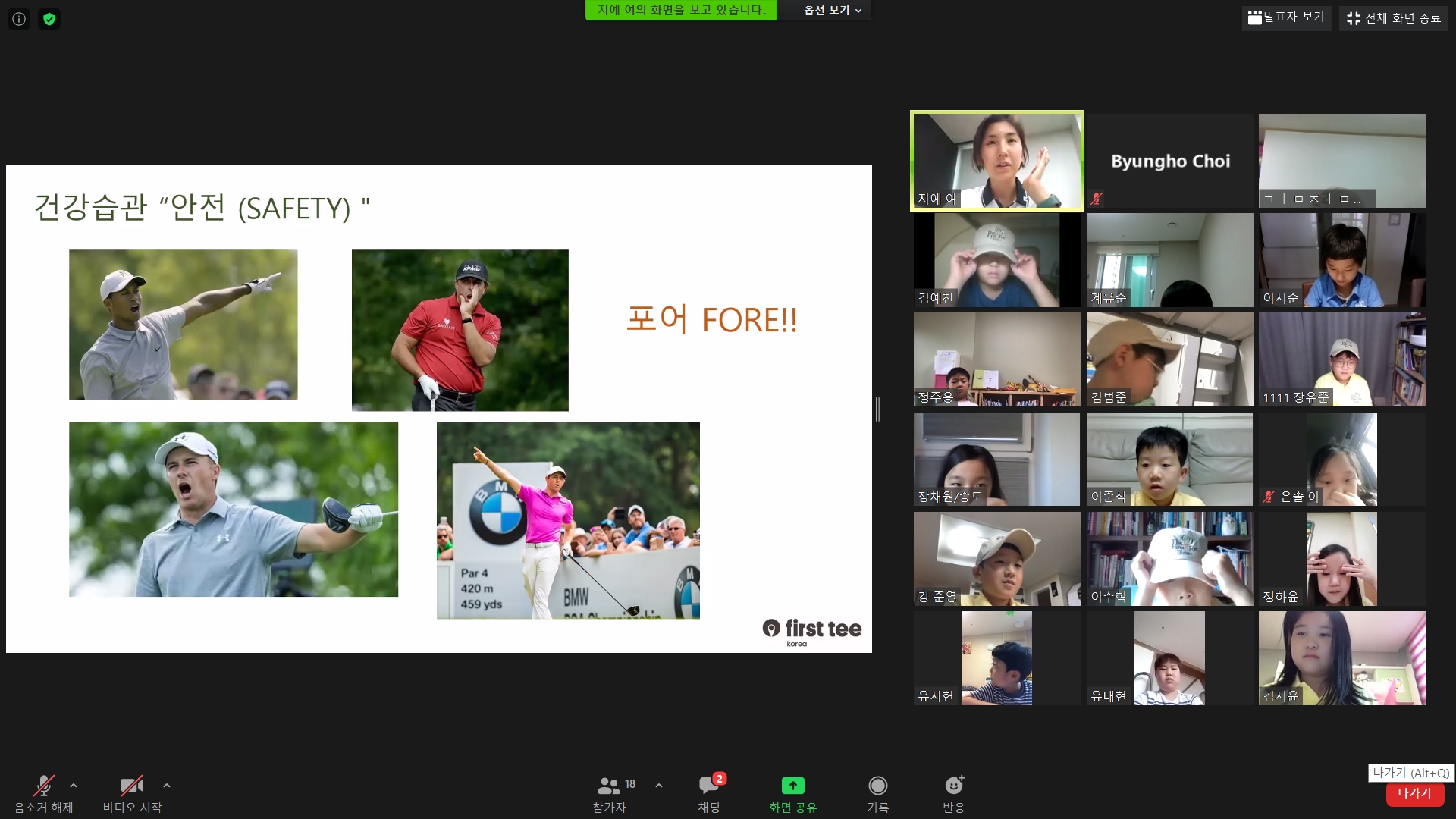 자신이 친 볼이 다른 사람에게 맞을 수 있을 경우 이를 알리기 위해 "포어"라고 소리쳐야 한다는 것을 알려주는 모습