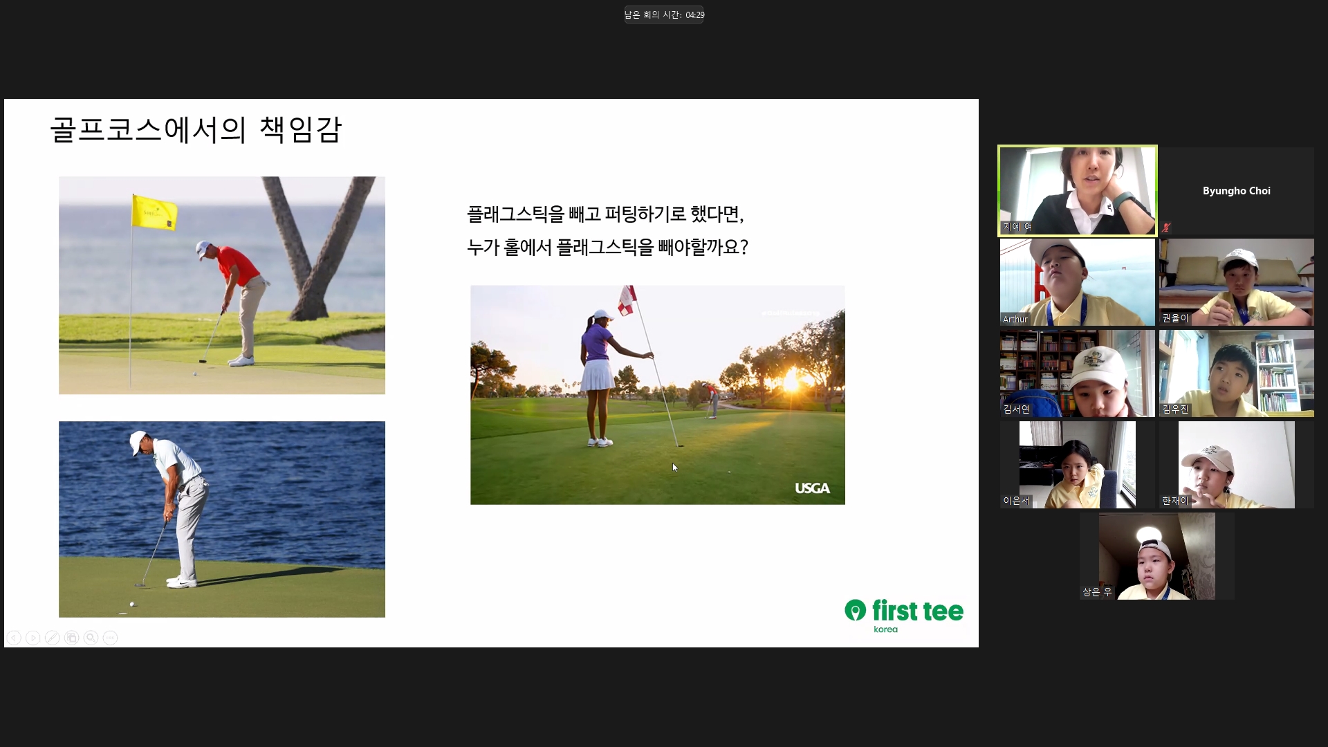 그린 위 깃발과 가장 가까이 있는 사람이 경기동반자를 위해 깃발을 뽑아줄 수 있다는 내용을 설명해 주고 있는 모습