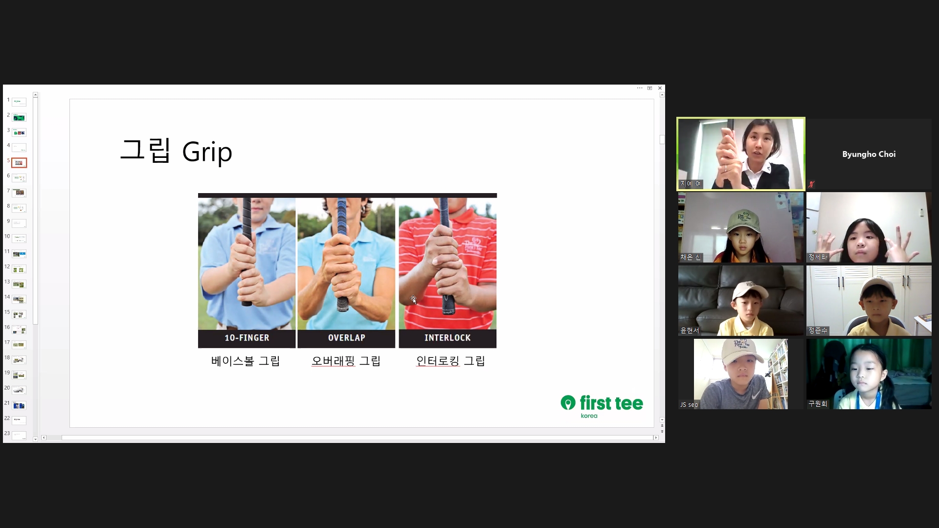그립의 종류 가운데 오버래핑 그립에 대해서 설명해 주고 있는 모습