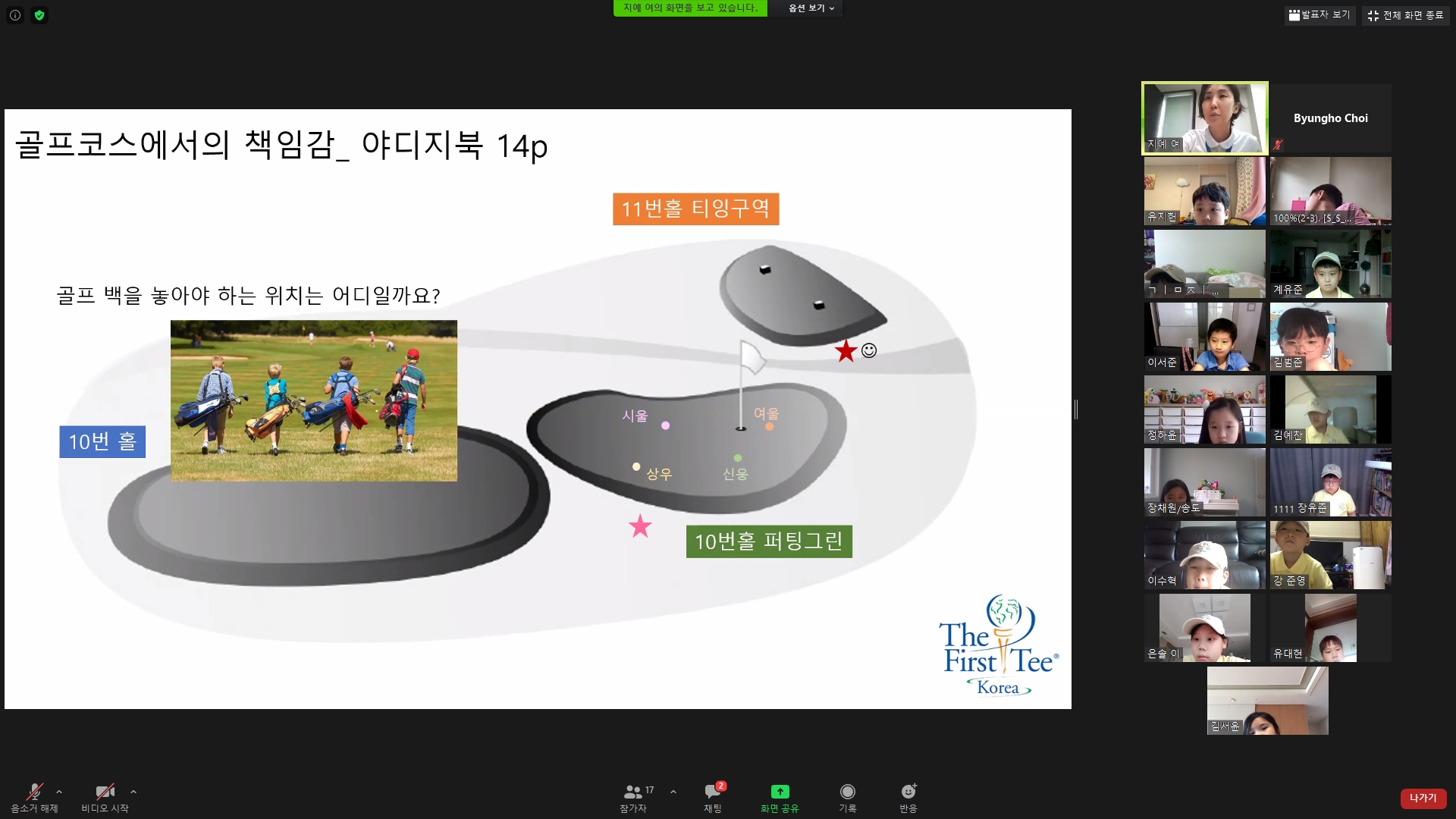그린에 도착했을 때 골프백을 놓아야 하는 위치에 대해서 설명해 주고 있는 모습