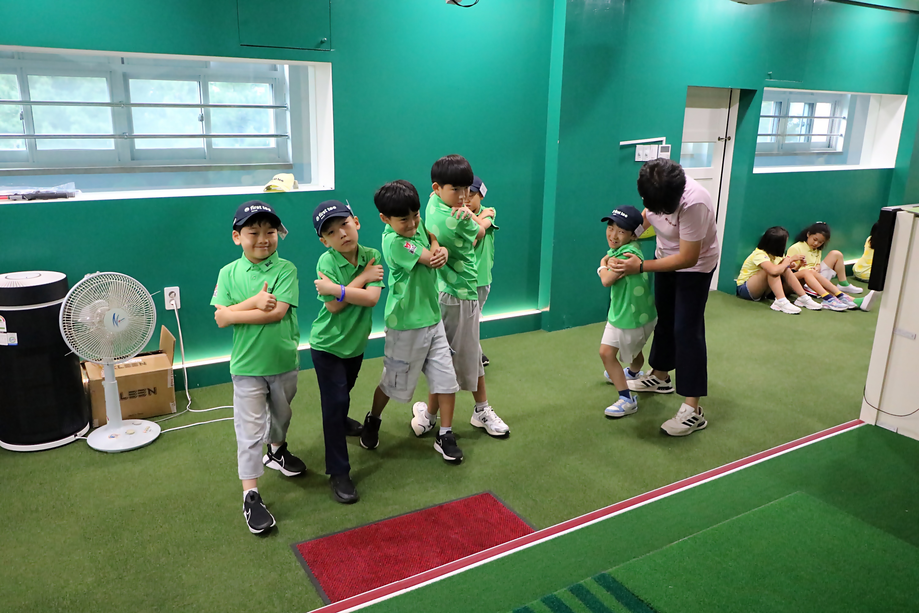 몸통 회전할 때 올바른 자세를 일일이 교정해주고 있는 모습