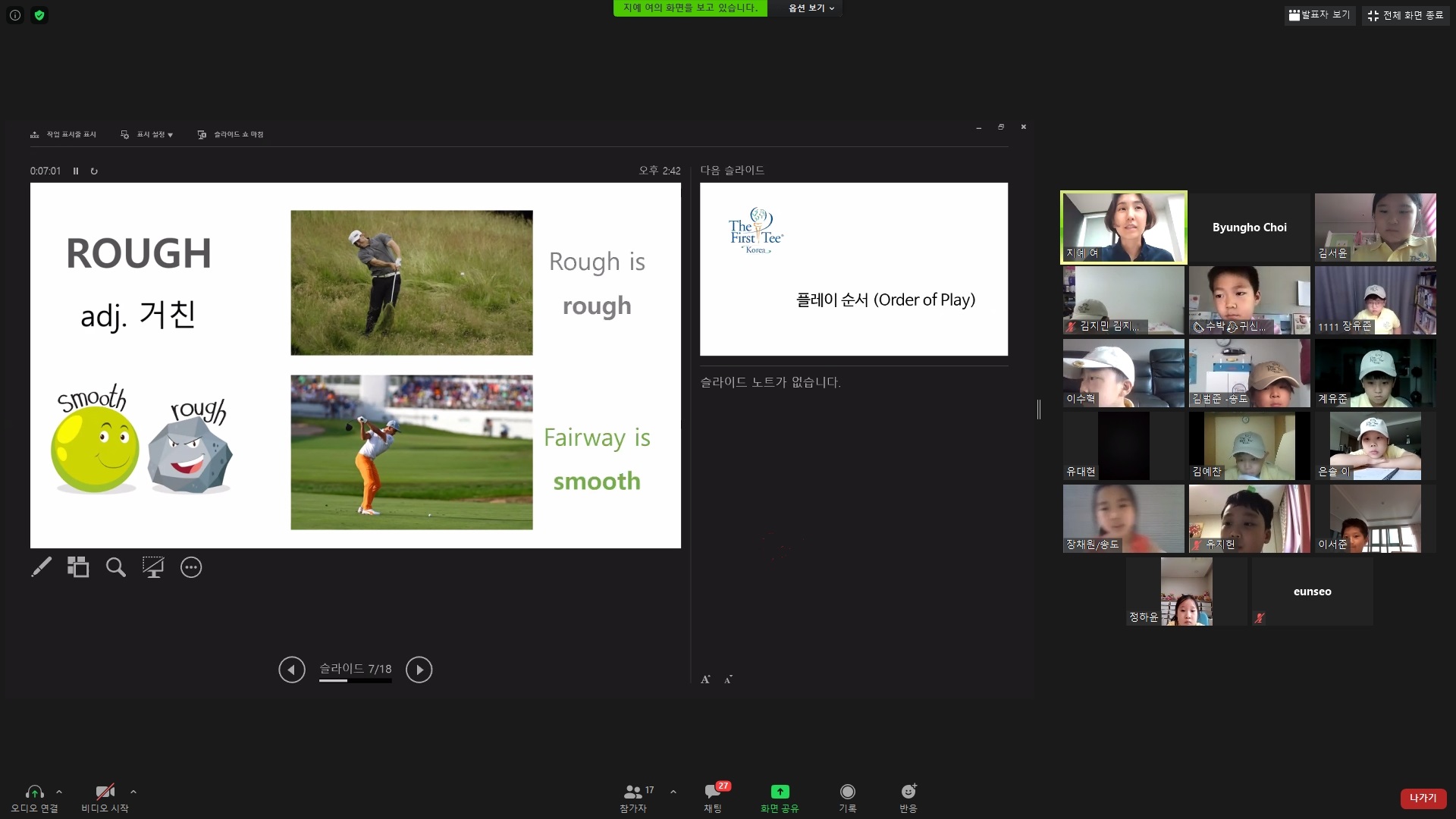 러프와 페어웨이에 대해서 설명해 주고 있는 모습