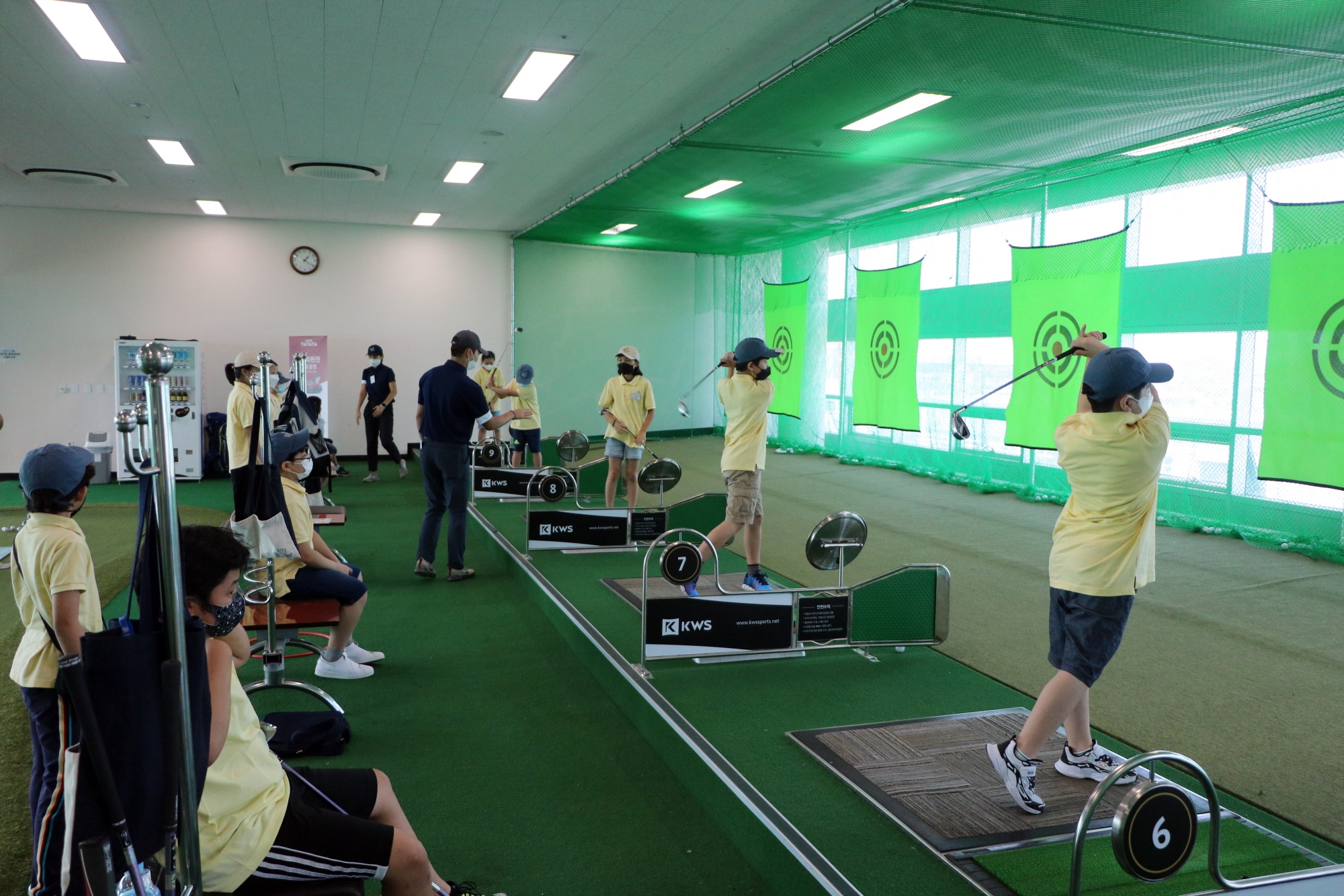 순서에 맞게 차례대로 스윙연습을 하고 있는 아이들과 자세교정을 해주고 있는 코치들