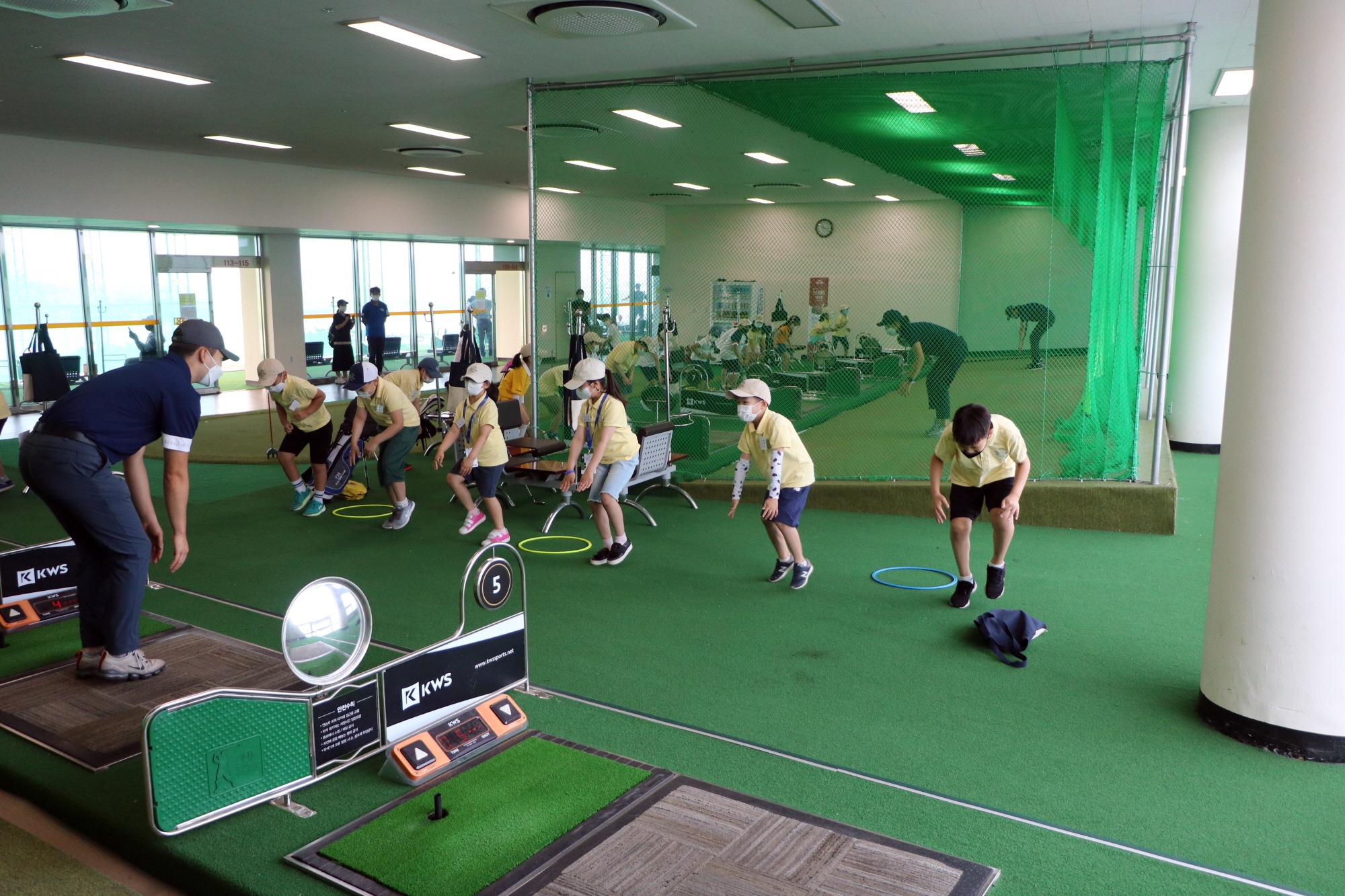 본격적인 골프실습에 앞서 제자리 뜀뛰기를 하며 가볍게 몸을 풀고 있는 아이들