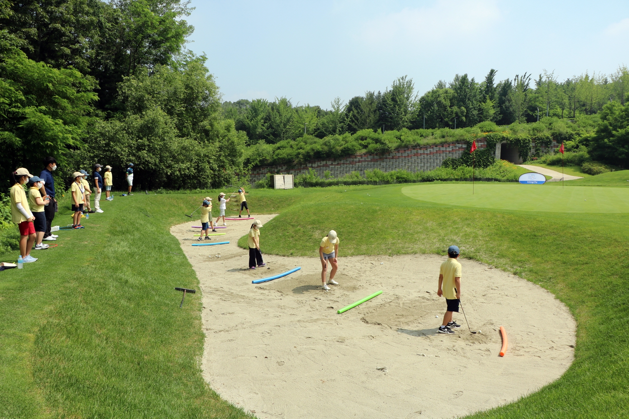 다른 샷과는 달리 공 뒤 모래를 먼저 쳐야 하는 벙커샷을 실습하고 있는 아이들