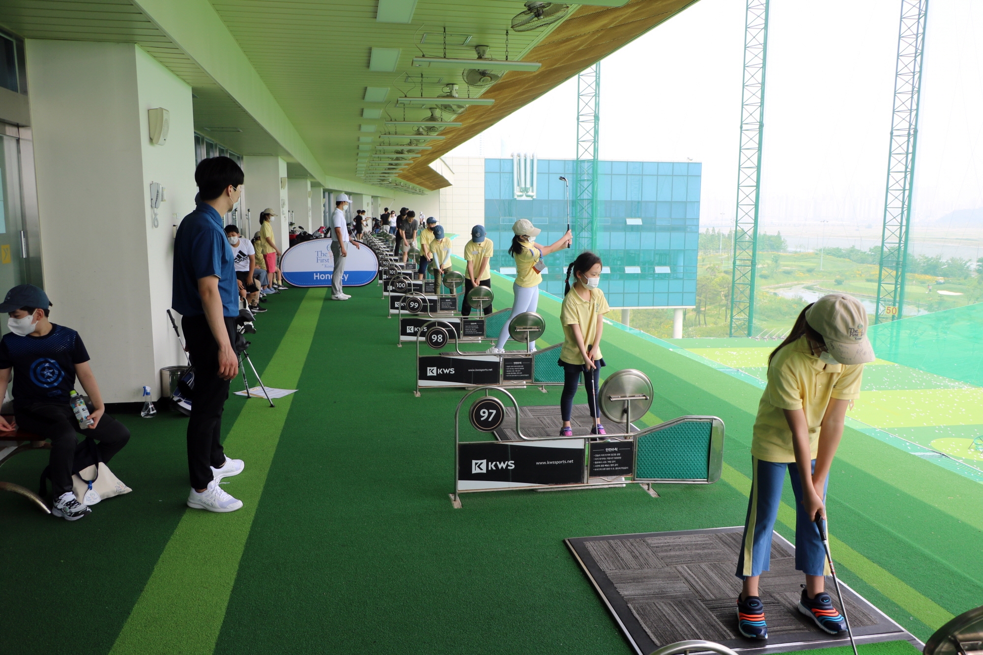 코치님의 지도에 따라 풀스윙 실습을 하고 있는 아이들