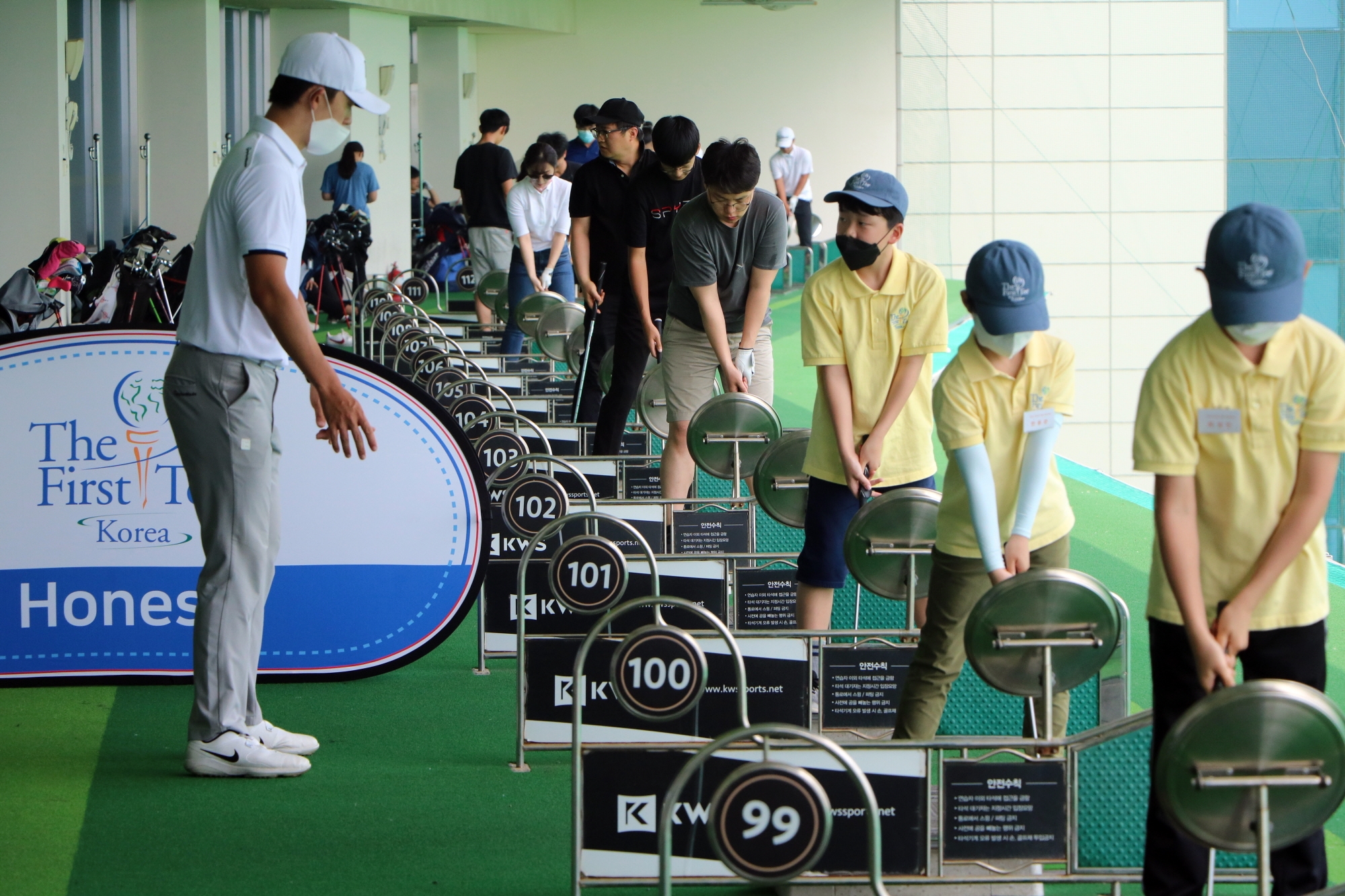 그 어느 때보다 진지하게 일일명예코치인 김비오 프로에게 레슨 받고 있는 아이들