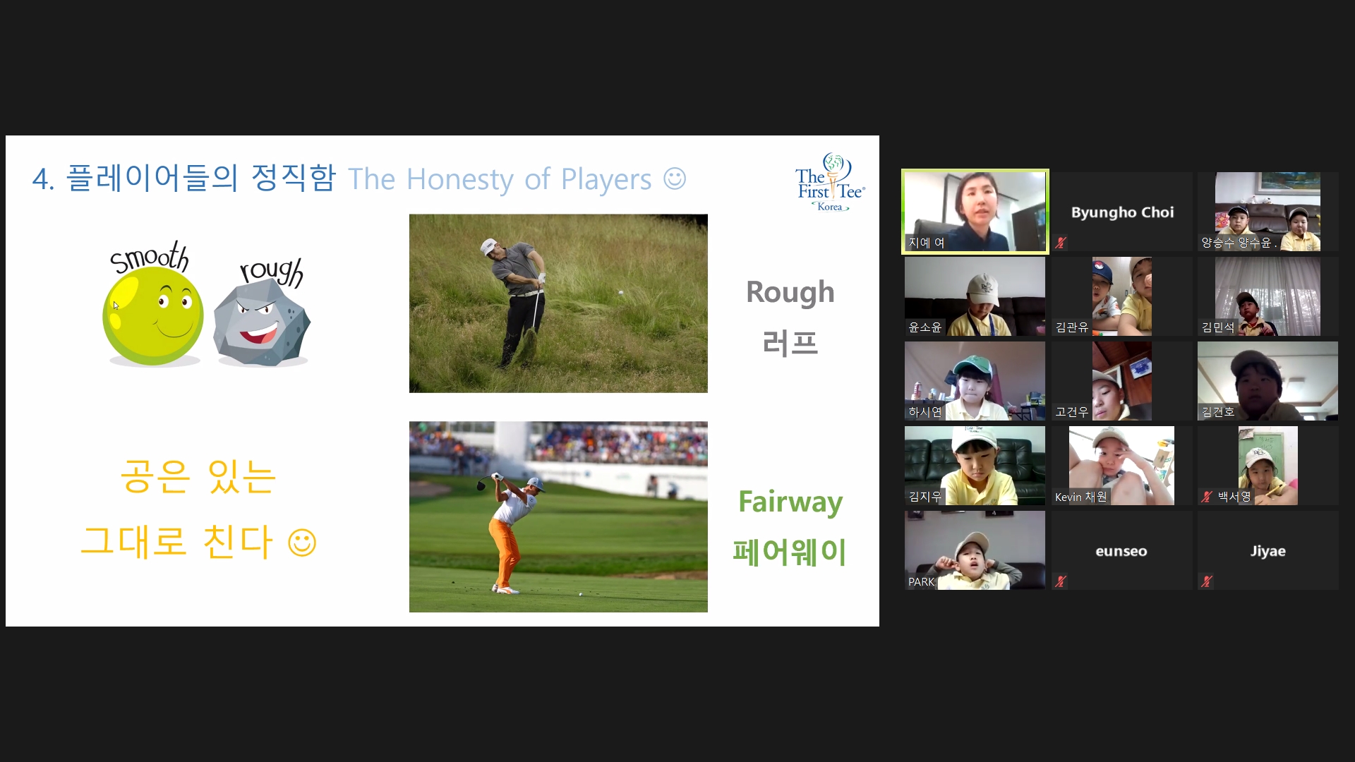 골프코스에 대한 설명시간으로 페어웨이와 러프에 대해서 설명해 주고 있는 모습