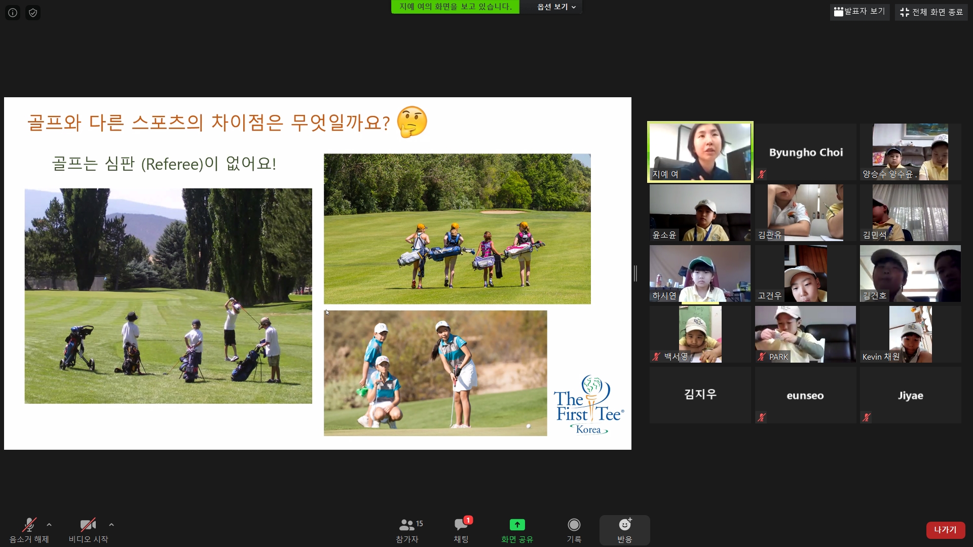 다른 스포츠 종목과의 다른 점으로 골프경기엔 심판이 없다는 것을 설명해 주는 모습