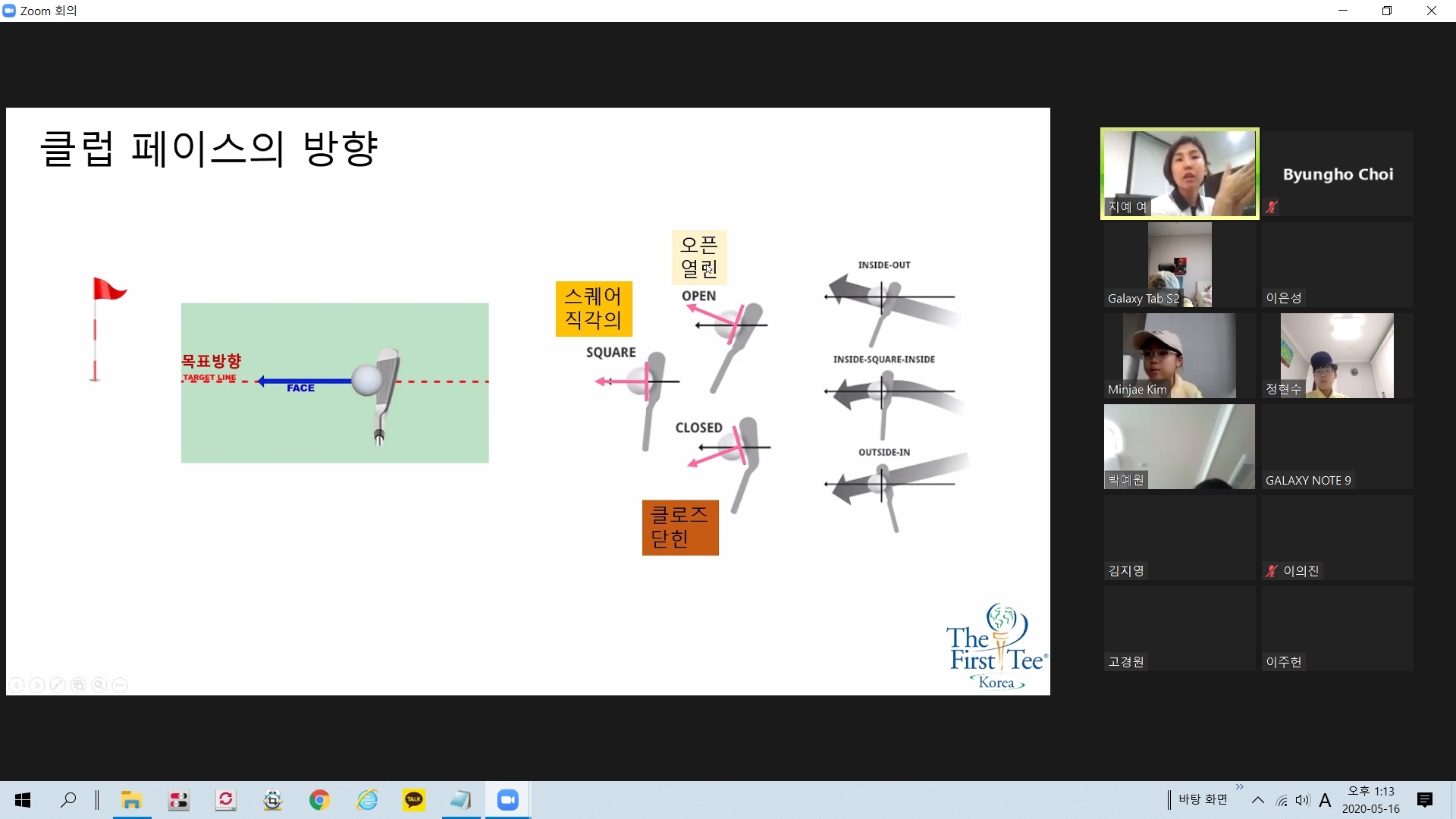 임팩트 때 클럽페이스의 상태에 따라 공이 날아가는 방향이 달라지는 것에 대해서 설명해 주는 모습