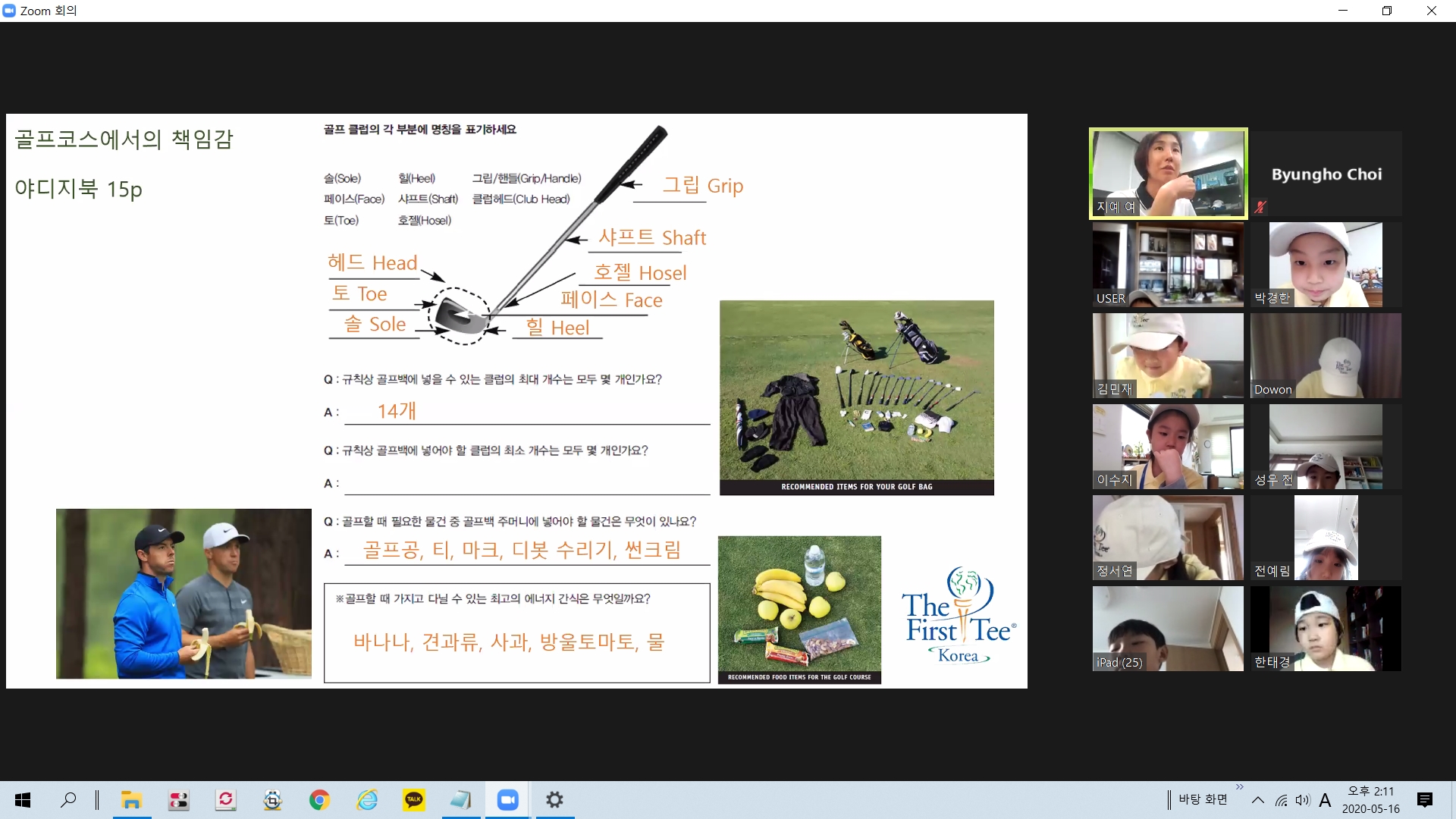 골프백 안에 넣고 다니는 소지품의 종류에 대해서 설명해 주는 모습