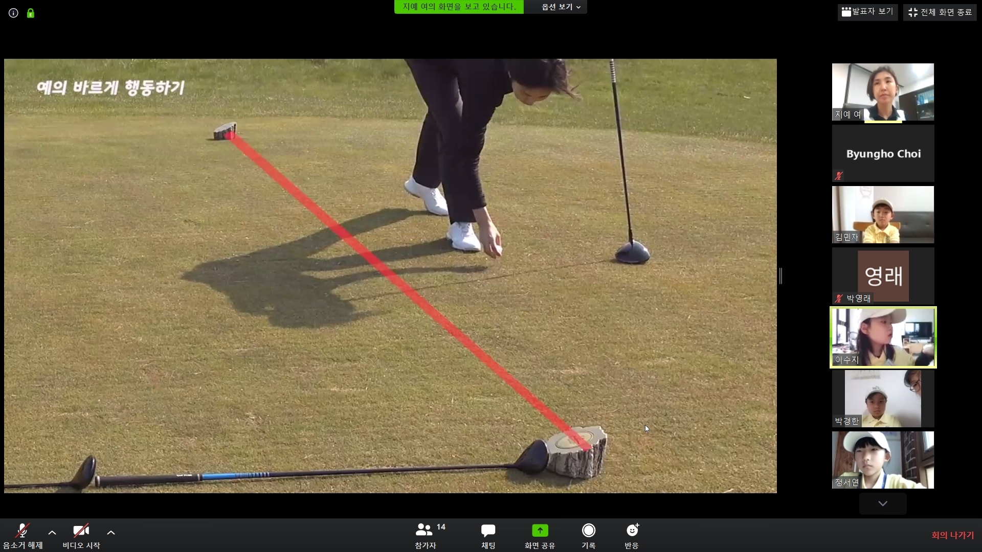 티잉구역에서 올바르게 티를 꽂는 방법에 대해서 설명해 주고 있는 모습. (티를 티마커보다 앞에 꽂으면 안됨)