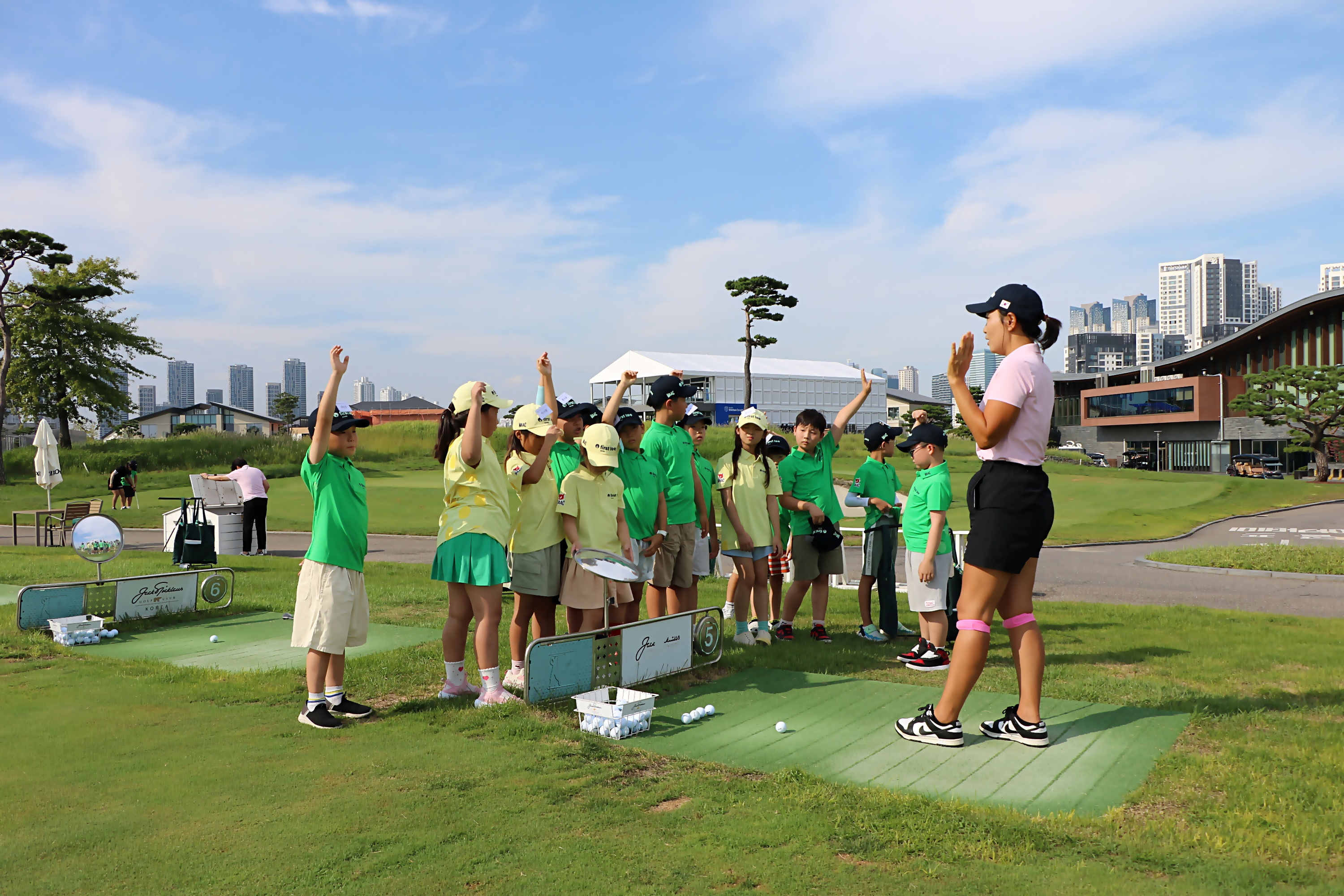 골프스윙과 관련하여 코치님의 질문에 답하며 기초적인 골프 지식을 쌓아가는 아이들