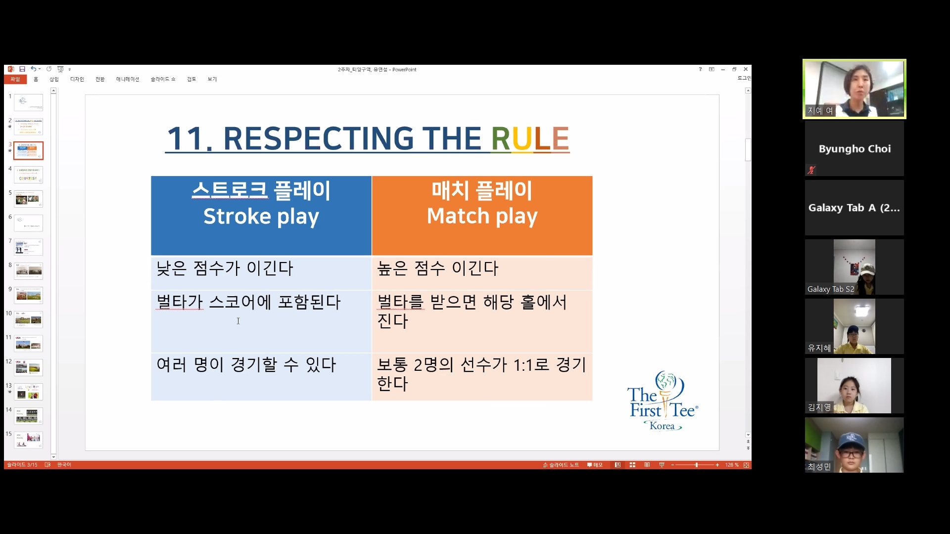골프경기방식의 종류에 대해서 설명하고 있는 모습