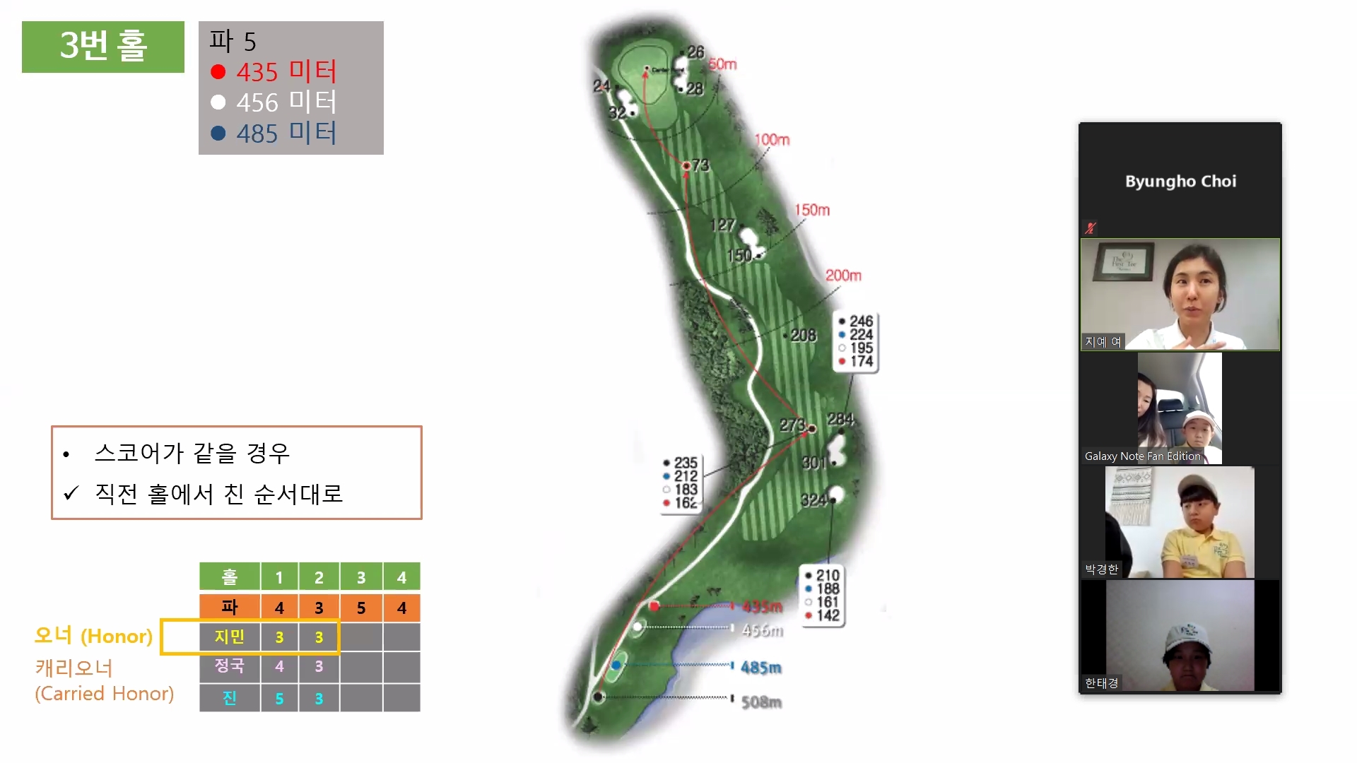전홀에서 모두 같은 점수를 기록했을 때 오너를 정하는 방법에 대해서 설명하고 있는 모습