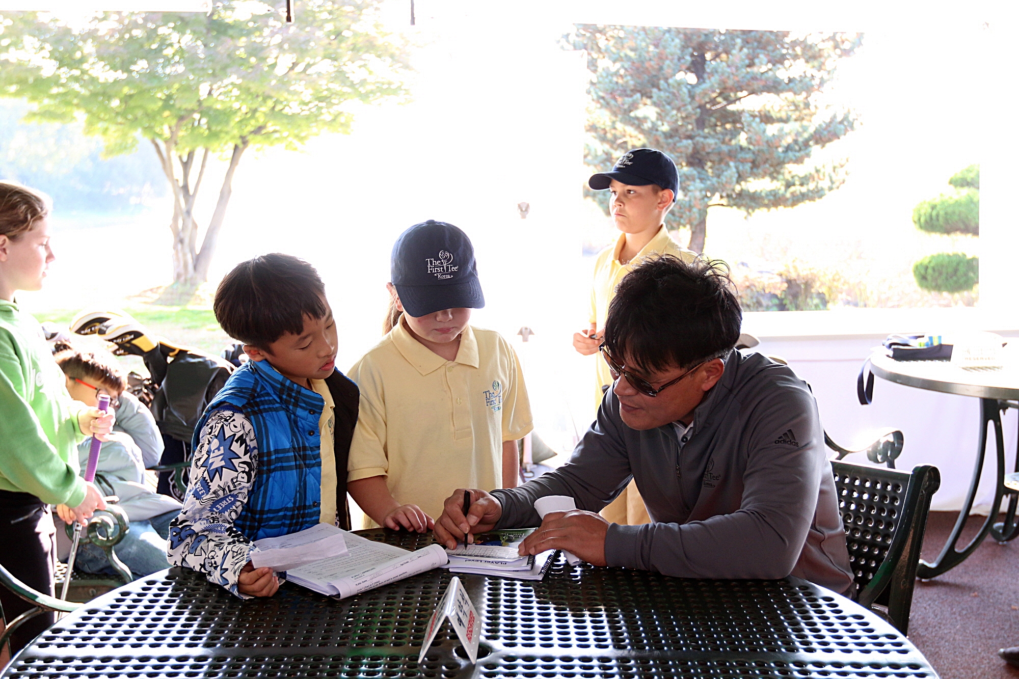 코치님께 라운드를 하며 자신이 적은 스코어 카드를 제출하고 있는 모습
