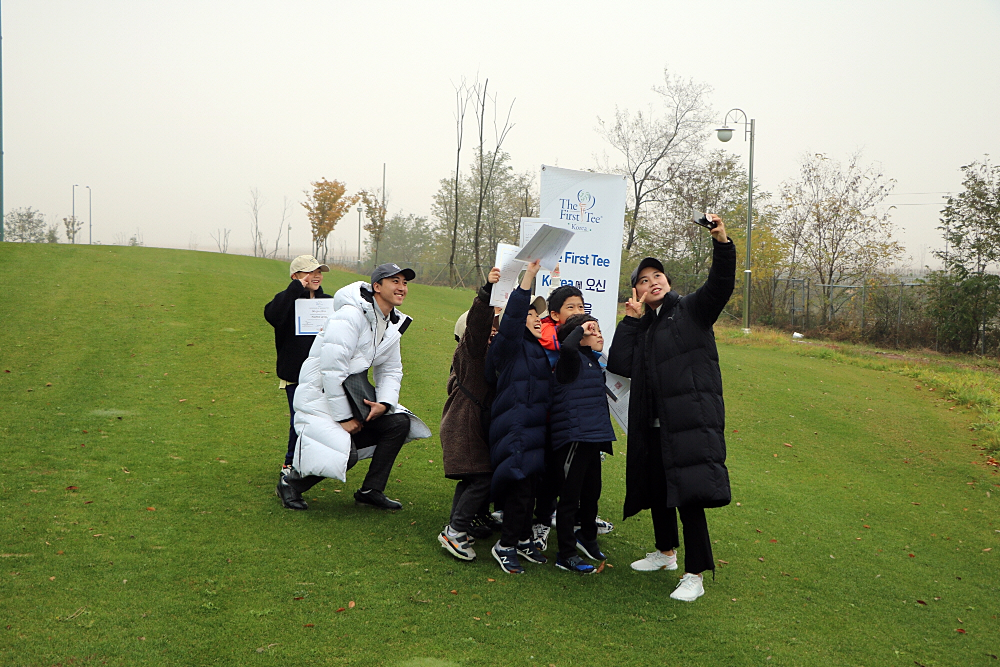 코치님과 함께 셀카를 찍으면서 추억을 간직하고 있는 아이들