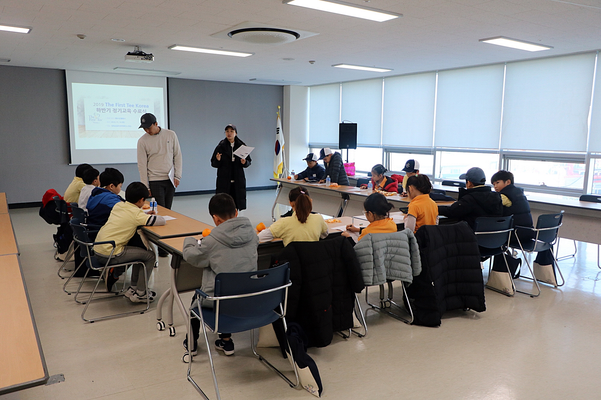 종합평가 시험을 치른 후 코치님과 함께 정답을 맞추고 있는 아이들