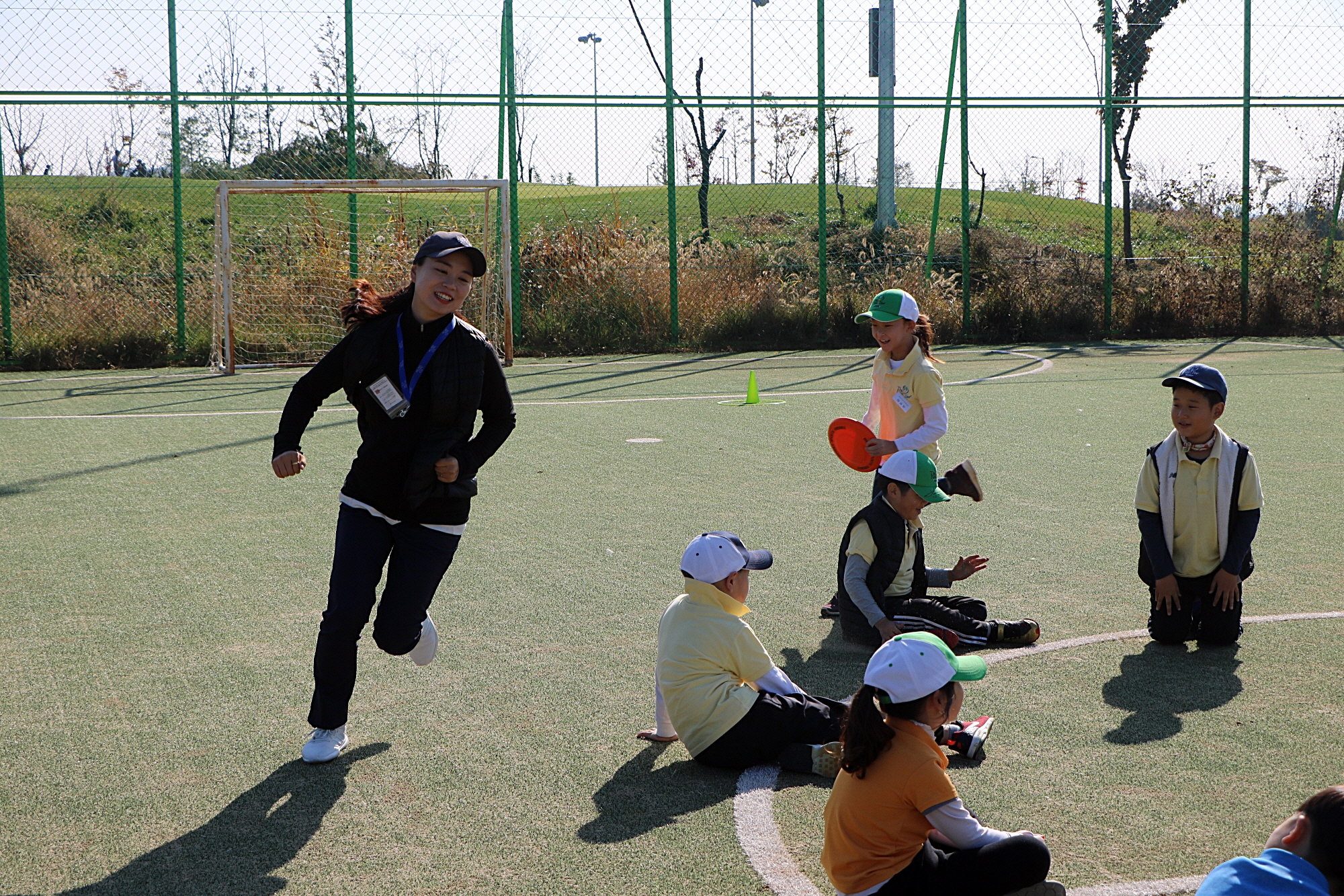 코치님을 잡기 위해 전력질주를 하며 즐거워하는 모습