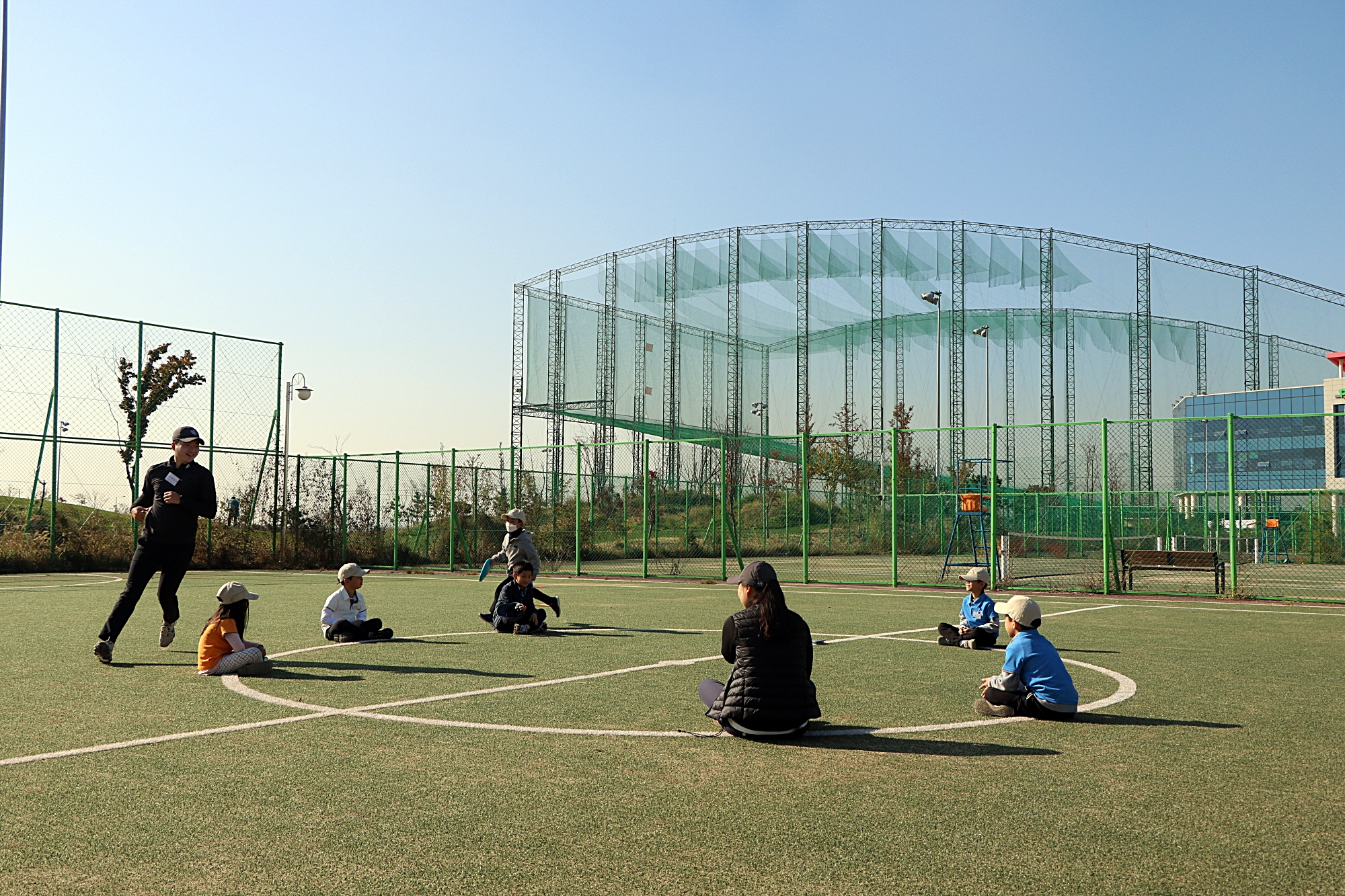 재밋게 몸풀기를 하기 위해 원반으로 수건돌리기를 하며 즐거운 시간을 보내고 있는 아이들