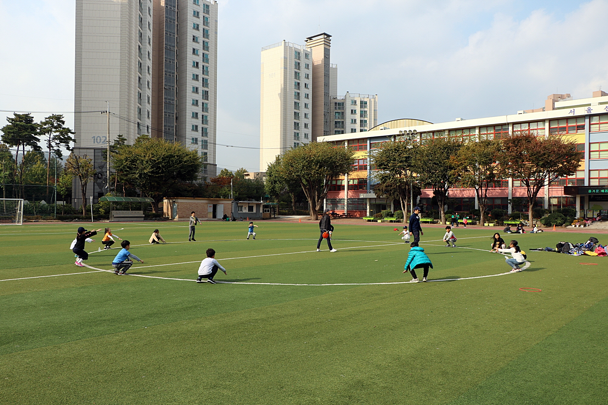 코치님의 구령에 맞춰 스쿼트 자세를 취하며 하체운동을 하고 있는 아이들