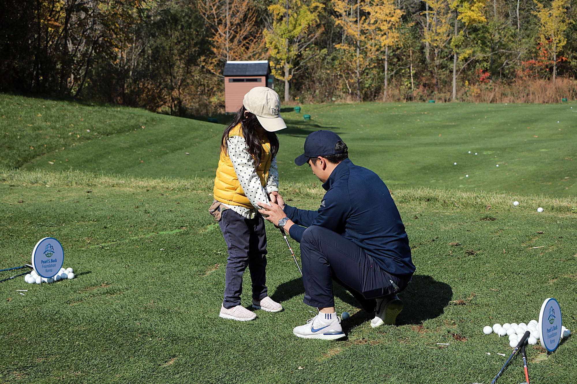 아이언 샷 풀스윙 자세를 1:1로 교정해 주고 있는 모습