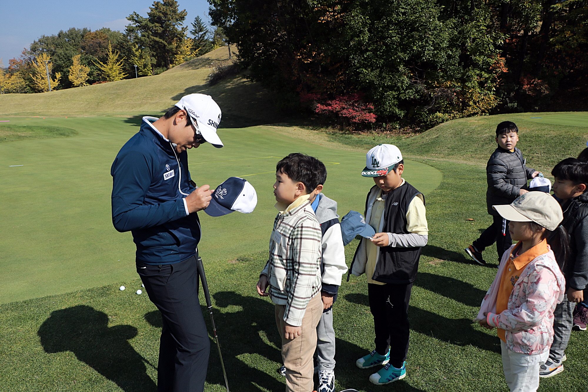 한국 남자 프로골프계의 간판스타인 김경태 프로가 더 퍼스트 티 교육생들 모자에 일일이 사인해주며 즐거운 시간을 보내고 있다.
