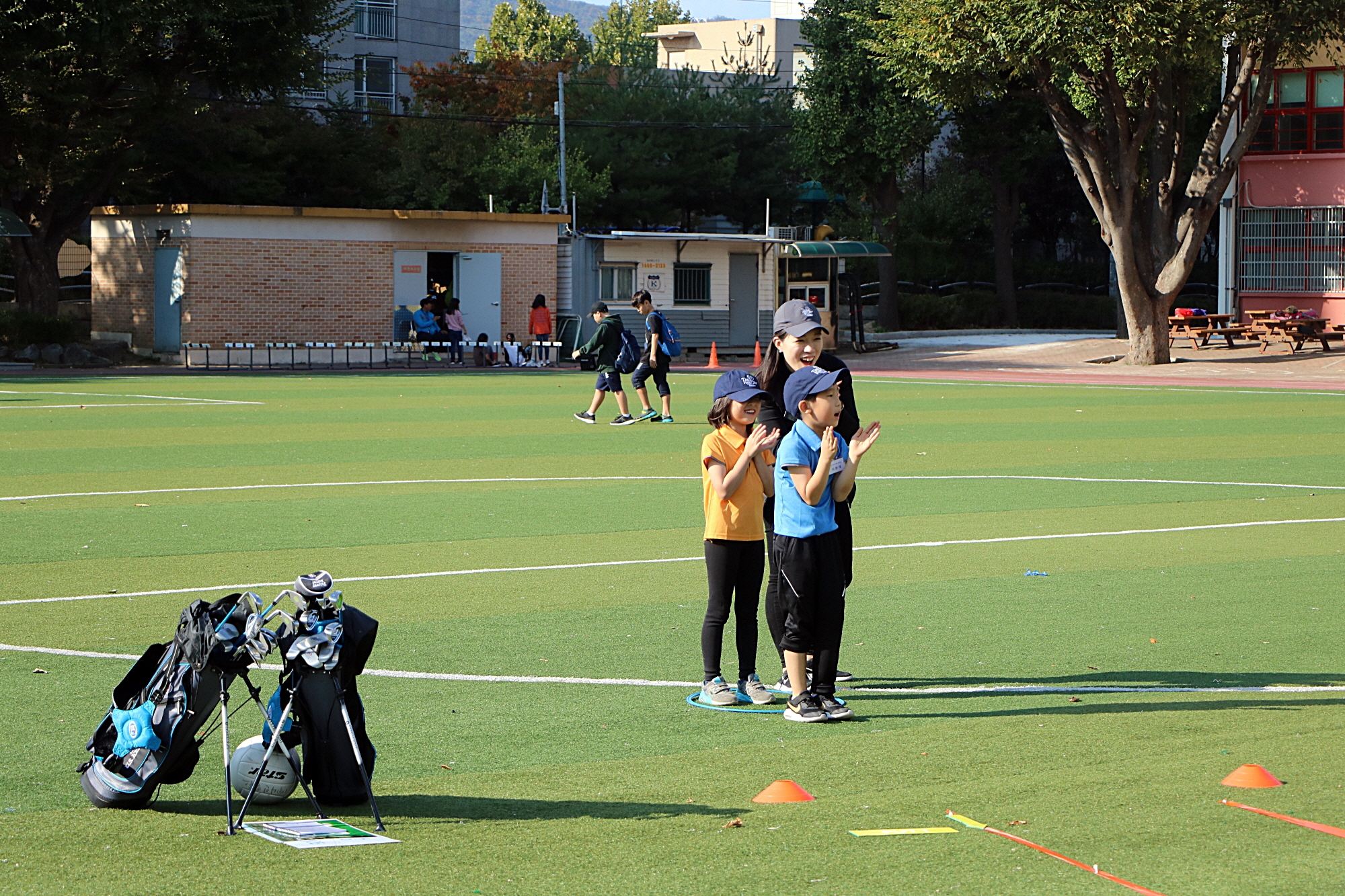친구의 홀인 성공을 코치님과 함께 진심으로 축하해 주는 아이들 모습