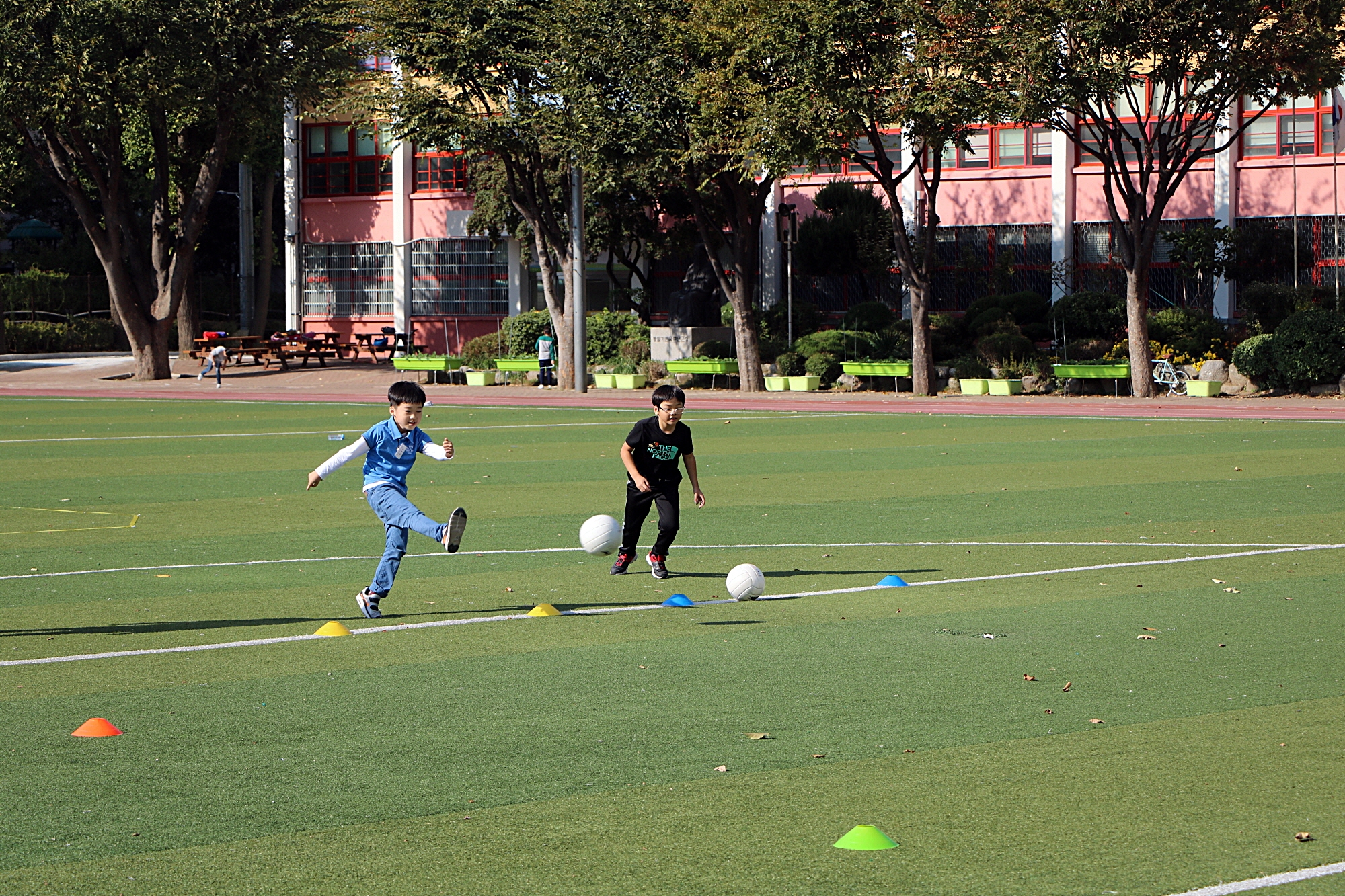 축구골대를 향해 힘차게 슛을 날리는 아이들