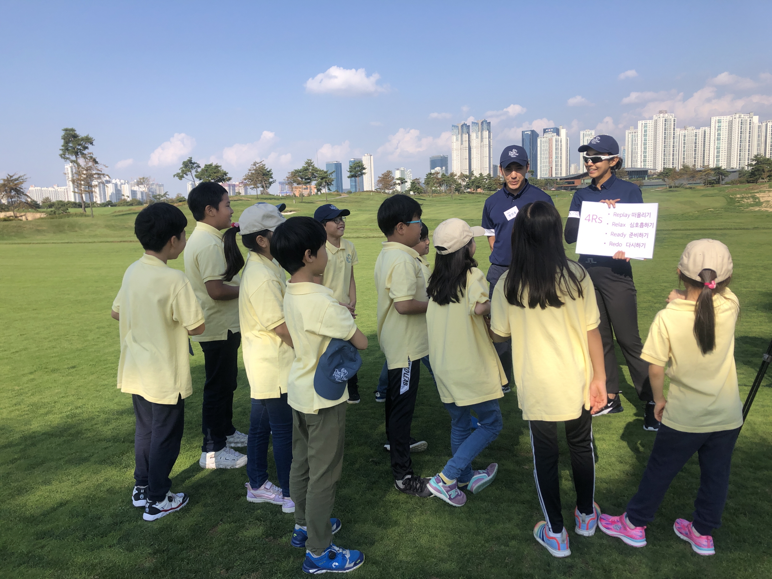 오늘 플레이 하며 '4Rs' 를 생각하며 했는지 코치님과 이야기 하고 있는 교육생들