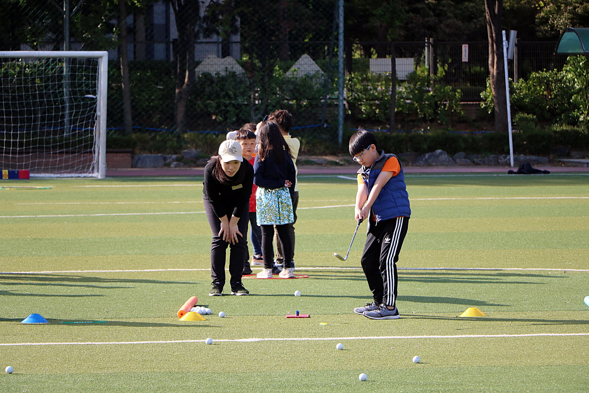 코치님이 지켜보는 가운데 전방 타겟을 향해 신중하게 칩샷을 하고 있는 모습