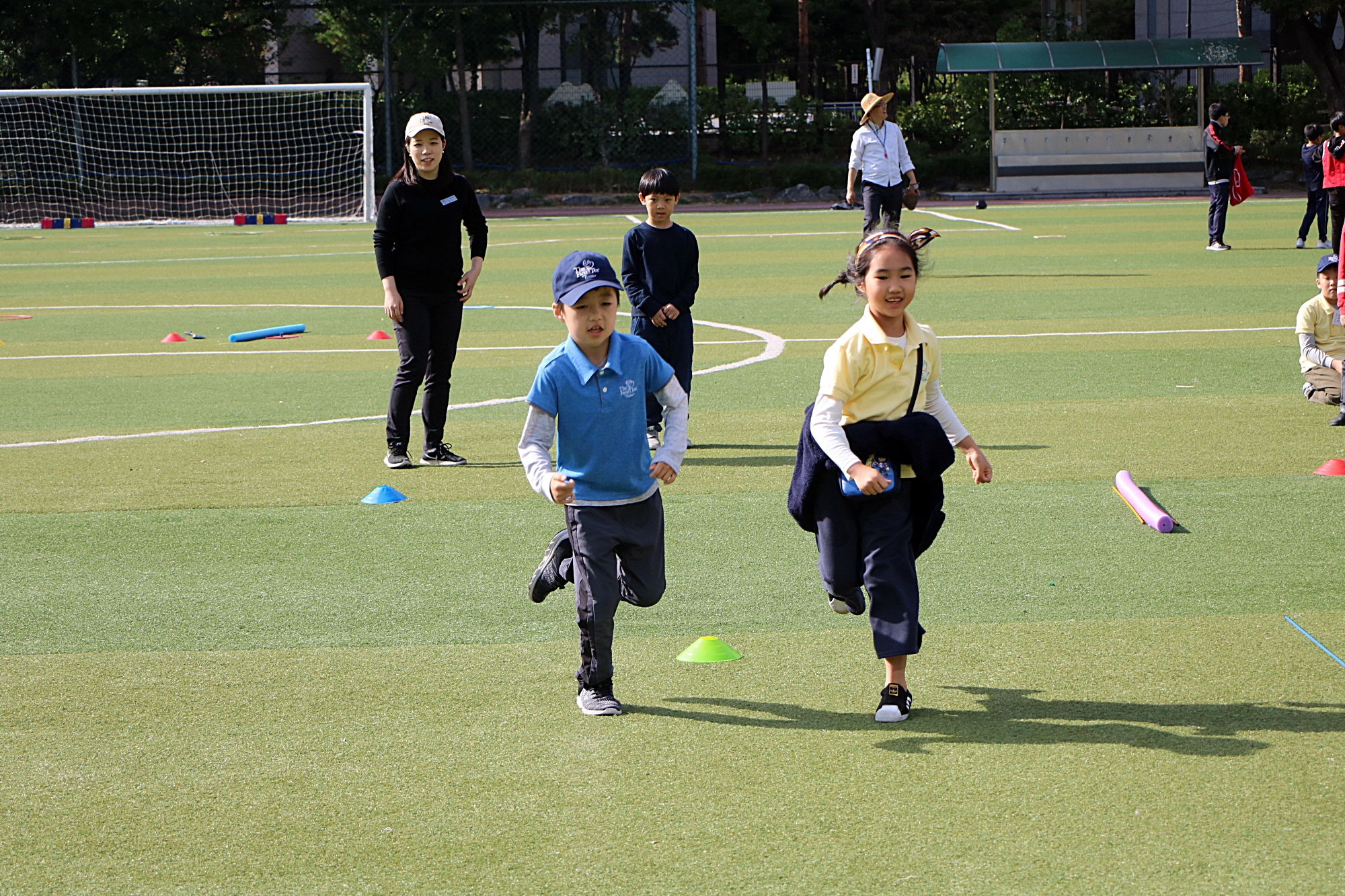 2인 1조로 팀을 이뤄 자기 파트너와 함께 호흡을 맞춰 한발 뛰기를 하고 있는 모습